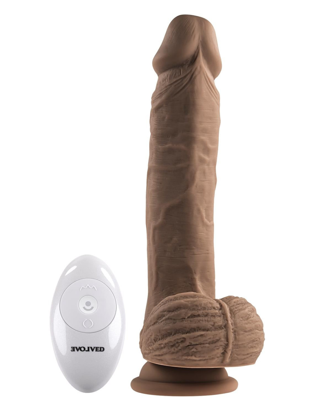 This deliciously realistic vibrating dildo is robust and multi-functional with 7-speed twirling and twisting in the top half of the shaft and intense 8-speed vibrations throughout. A powerful suction cup base adheres beautifully to any hard surface while the 25’ range remote control lets you operate both motors independently. Crafted to look just like the real thing - complete with textured balls and crown tip - this large life-like toy is magnetic rechargeable, splashproof and easy to clean.Large realistic thrusting, twirling remote vibrator8 Vibrating speeds & patterns in the shaft7 Twirling & thrusting speeds & patterns (0.5' / 1,3 cm thrust)Made from creamy smooth siliconeRemote made from ABS plasticHeight: 9” / 22,8 cmDepth: 3.26” / 8,3 cmWidth: 2.51” / 6,4 cmInsertable length 6.5' / 16,5 cmInsertable diameter 1.65' / 4,2 cmRemote:Height: 3.15” / 8 cmDepth: 0.9” / 2,3 cm Width: 1.68” / 4,3 cmRemote range 25' / 7,6 metersPhthalate & latex-freeMagnetic rechargeable, USB cable includedRemote uses one CR2032, includedSplashproof