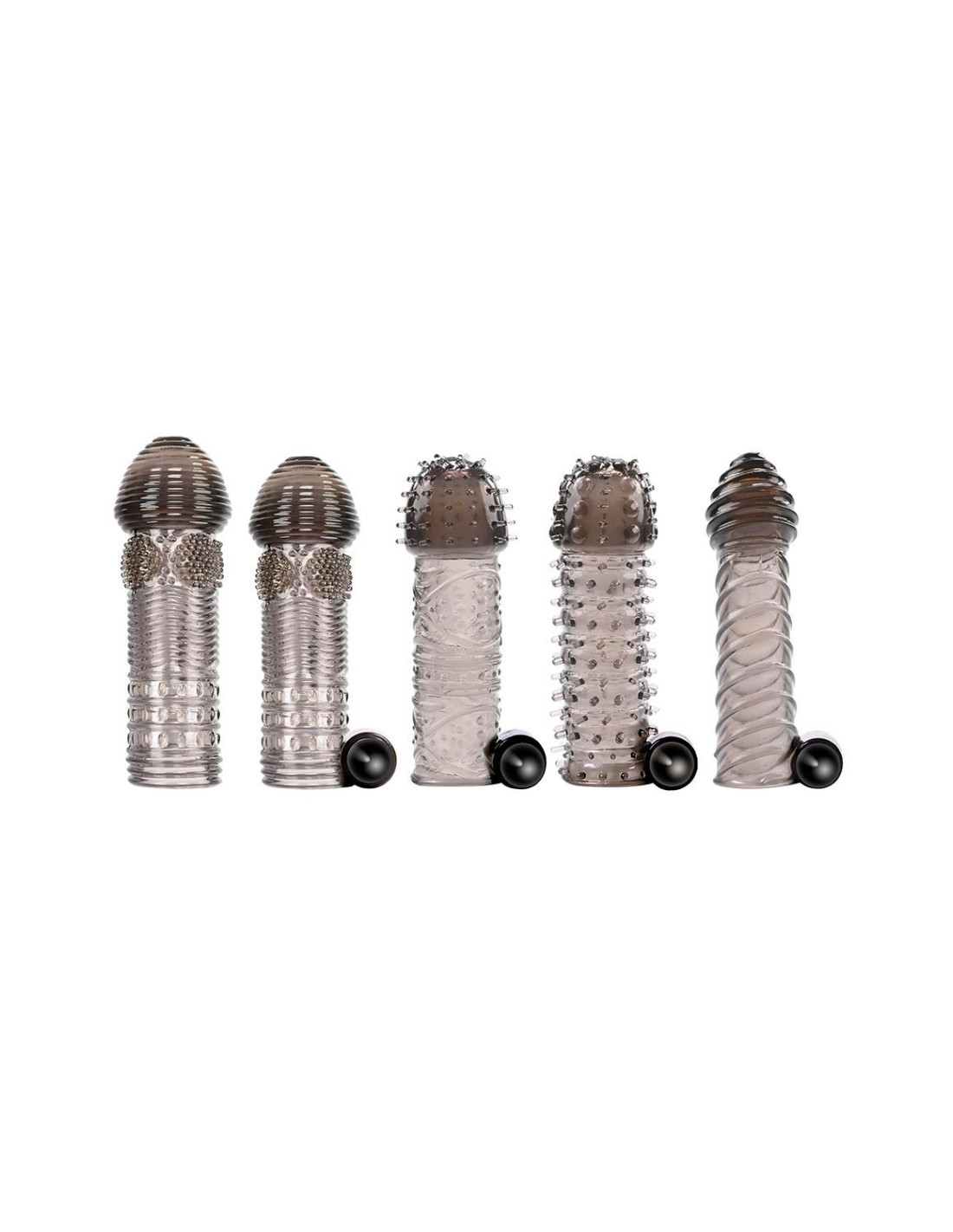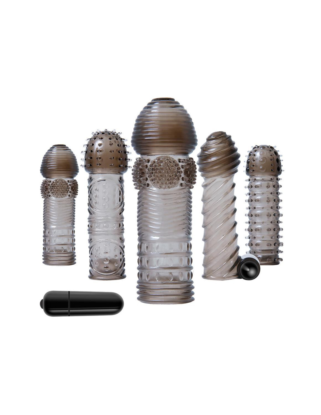 Add length and girth to your member with 5 unique sleeve designs that enhance any sexual experience with tantalizing textures and intense vibrations.Made from phthalate & latex-free TPR rubber4 Smoke-colored sleeves with bullet holsters at the base1 clear sleeve without bullet holster1 vibrating bullet included, batteries includedSleeve #1:Height: 5.08” / 12,9 cmWidth: 1.65” / 4,2 cmDepth: 1.73” / 4,4 cmInsertable length: 4.82” / 12,2 cmInsertable diameter: 1.06” / 2,7 cmSleeve #2:Height: 5.08” / 12,9 cmWidth: 1.65” / 4,2 cm Depth: 1.73” / 4,4 cmInsertable length: 4.82” / 12,2 cmInsertable diameter: 1.06” / 2,7 cmSleeve #3:Height: 5.08” / 12,9 cmWidth: 1.65” / 4,2 cm Depth: 1.73” / 4,4 cmInsertable length: 4.82” / 12,2 cmInsertable diameter: 1.06” / 2,7 cmSleeve #4:Height: 5.14” / 13 cmWidth: 1.44” / 3,6 cmDepth: 1.73” / 4,4 cmInsertable length: 4.82” / 12,2 cmInsertable diameter: 1.06” / 2,7 cmSleeve #5:Height: 5.21” / 13,2 cmWidth: 1.86” / 4,7 cmDepth: 1.86” / 4,7 cmInsertable length: 5” / 12,7 cmInsertable diameter: 1.08” / 2,7 cm