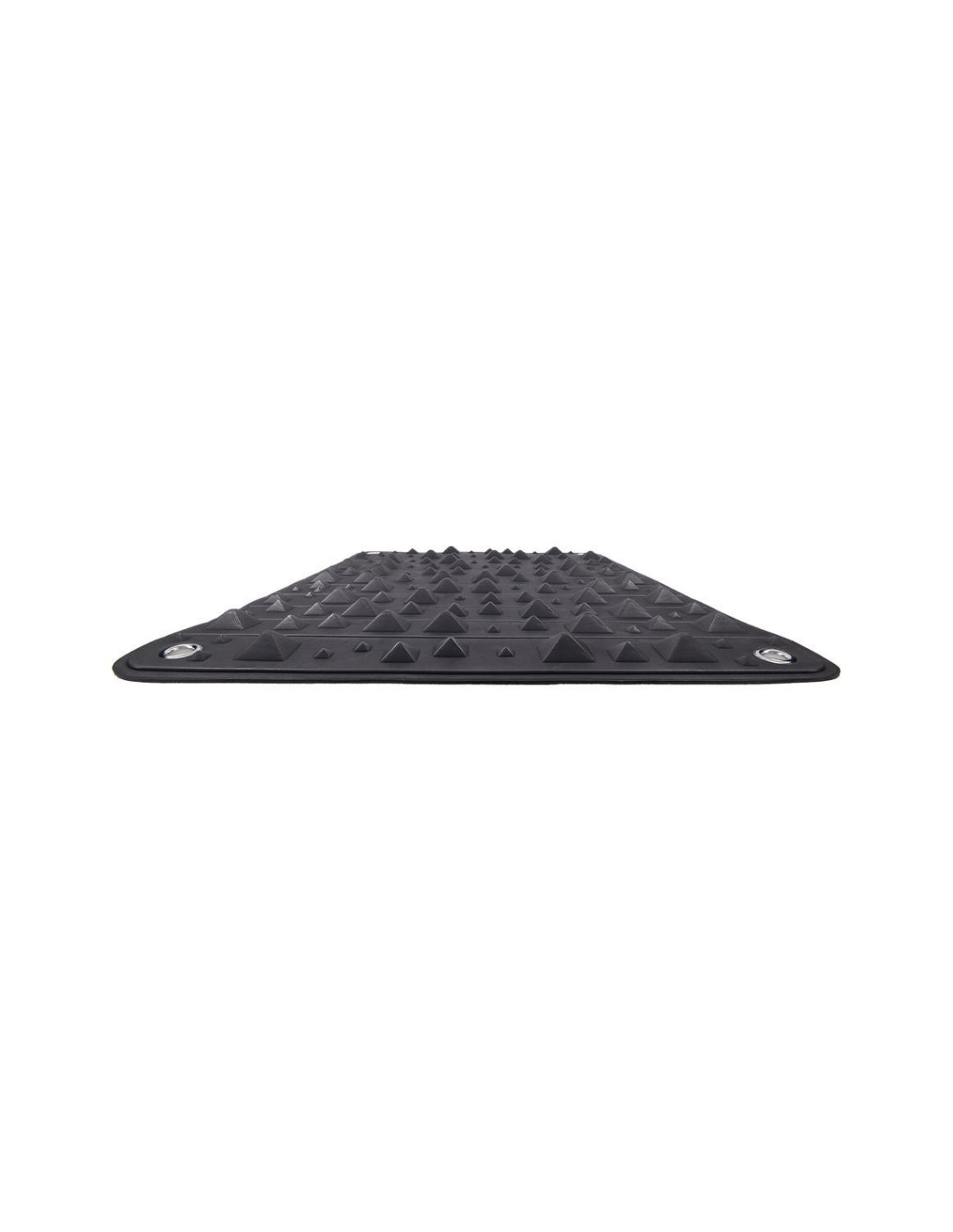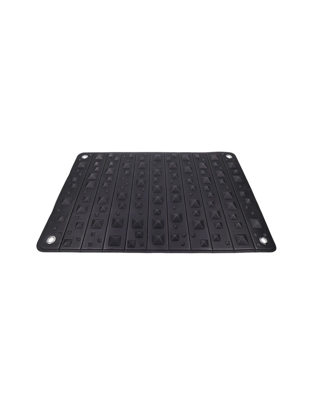 Endure the Pressure. Embrace the Power. The Edge® Spike Punishment Mat turns endurance into artful control. This firm foam mat features uneven rows of pyramid spikes that rise and fall in height, creating varied pressure points that challenge comfort and command stillness. Kneel, sit, or lie across its surface, the longer you remain, the deeper the pressure builds, transforming restraint into obedience and discomfort into devotion. Each corner is fitted with silver grommet holes for use with cuffs or rope, keeping the submissive securely in place as intensity mounts. When the scene is over, the mat rolls up neatly for storage in its black faux leather, dual-buckled holster. Built to test endurance and amplify control, it’s the ultimate tool for posture and pressure play.24” × 16” / 60 x  40 cm foam mat with three varied pyramid heights for progressive pressure playCorner grommet holes compatible with cuffs or rope for secure restraintWipes clean and rolls up for easy storage in black faux leather buckled holster