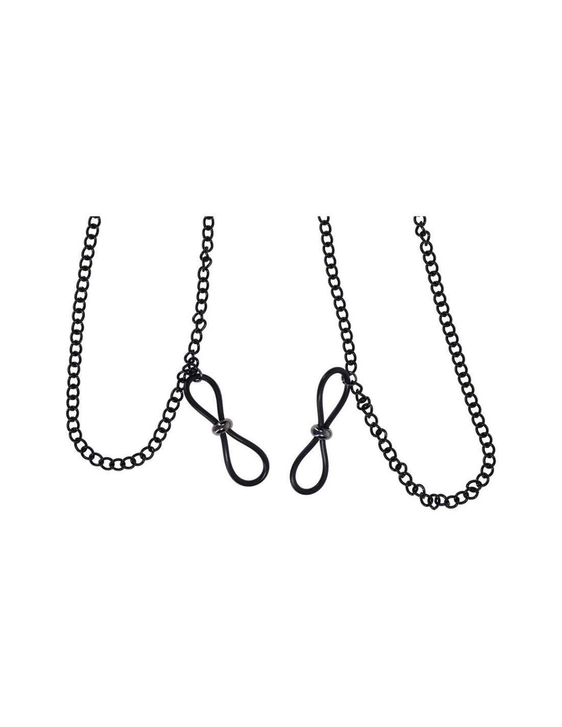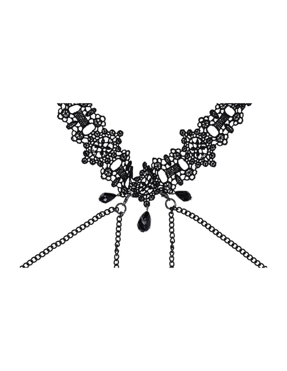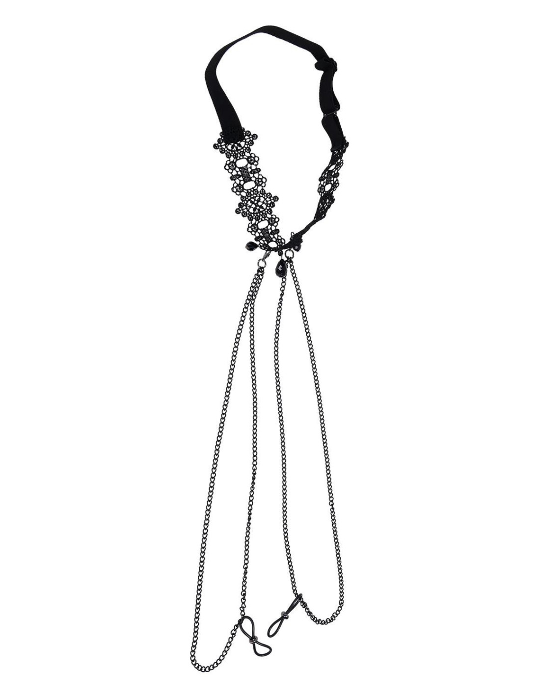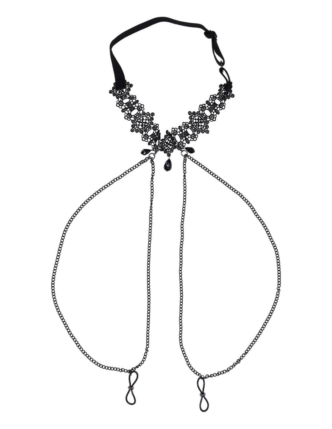 Dripping with dark elegance and sensual allure, the Lace Collar with Nipple Ties is designed for those who crave a touch of the unexpected. This ornate lace collar wraps comfortably around the neck, featuring an adjustable bra-strap-style back for the perfect fit. Glistening black gem stones dangle delicately from the collar, drawing attention to the neckline while adding a touch of mystery. The black double-chain draping connects effortlessly to adjustable nipple ties, offering a subtle yet seductive thrill. Designed to be stylish, sexy and discreet, this piece is perfect for those looking to turn up the heat - whether in public or behind closed doors.Adjustable bra-strap-style back fits up to 19' (48.3 cm) necksDetachable 11' (28 cm) dual draping chainsAdjustable silicone nipple ties for tailored sensationMaterials: 34% Nylon, 31% Polyester, 29% Iron Alloy, 4% Silicone, 2% Copper Alloy