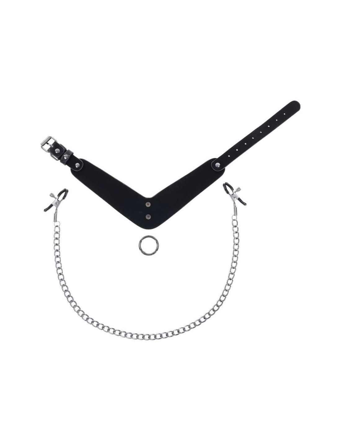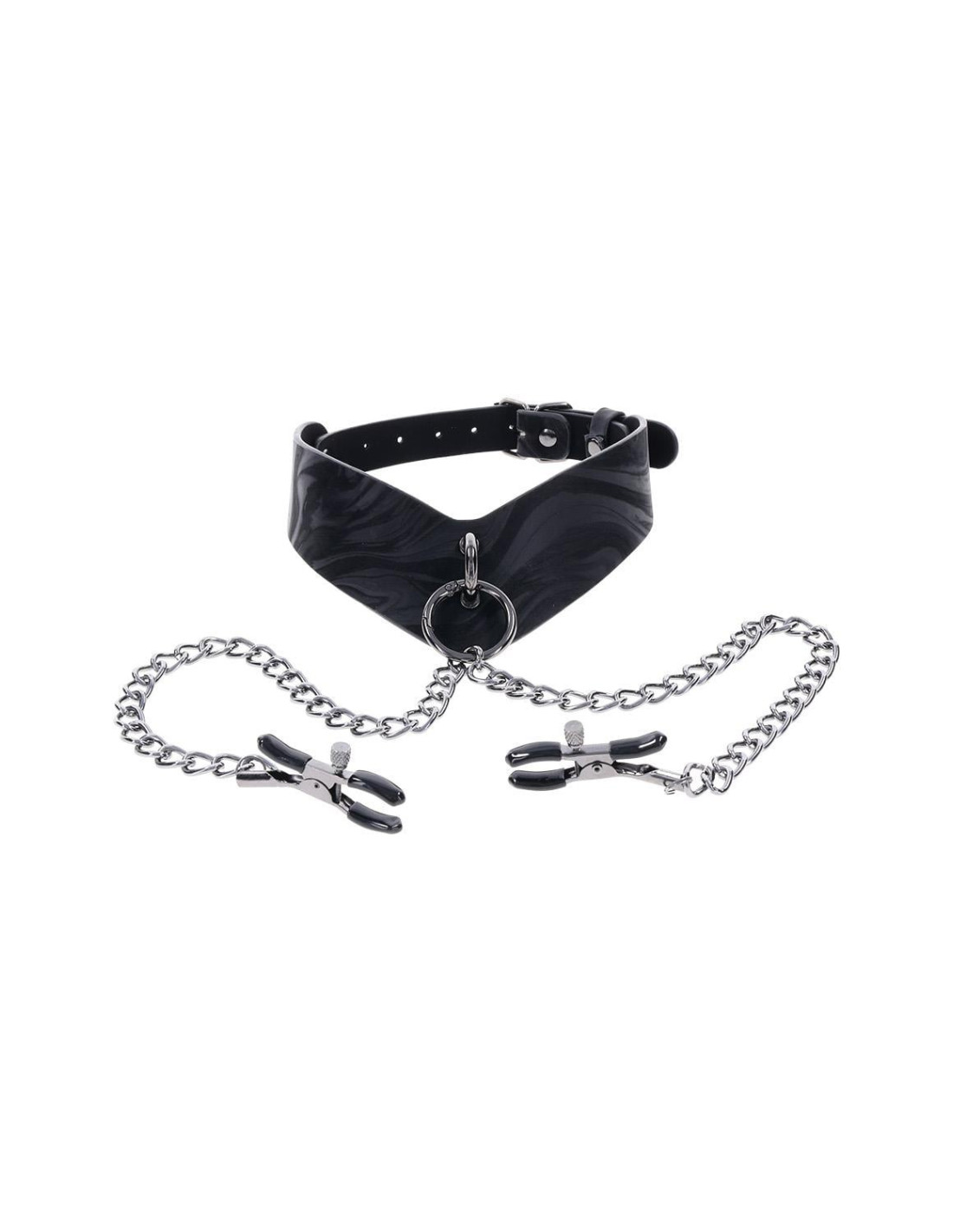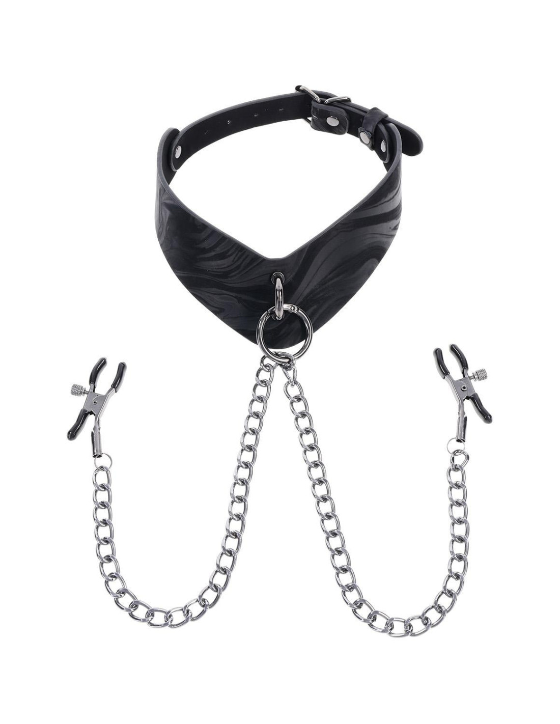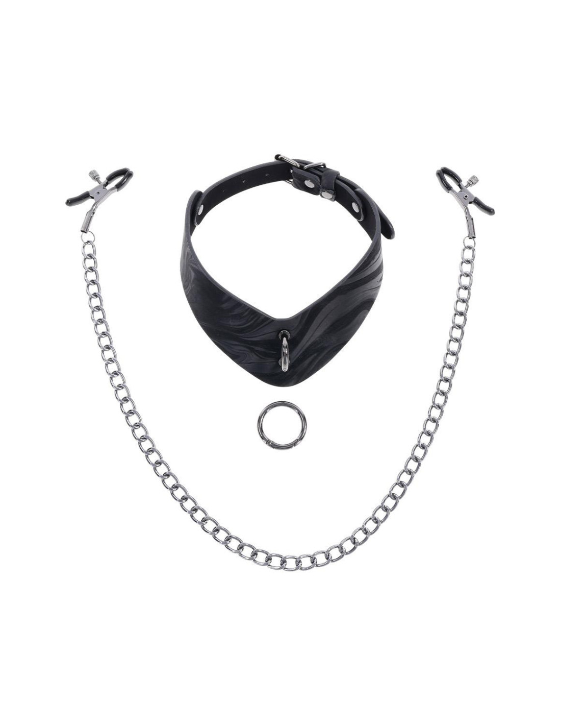 Elevate your scenes with the elegant dominance of the Velvet Noir Collar with Nipple Clamps. Crafted from smooth faux leather with a sleek marbled finish, this angled collar commands attention and control. Hematite-plated hardware, including a removable ring, offers both sophistication and functionality. A single metal chain connects to adjustable nipple clamps, adding a teasing element that can be removed for even more versatility. Use the collar with the clamps, swap in a leash, or wear it solo as a stylish day collar. Designed for both comfort and exploration, this piece invites you to play with power on your terms.Unique, angular collar which fits necks up to 20inch / 50cm offers a bold, refined lookHematite-plated hardware with a removable ring offers versatile use with nipple clamps, a leash (sold separately), or as a day collarRemovable 22inch / 55cm hematite chain with adjustable nipple clampsMaterials: 60% PU, 30% Iron Alloy, 10% Zinc Alloy