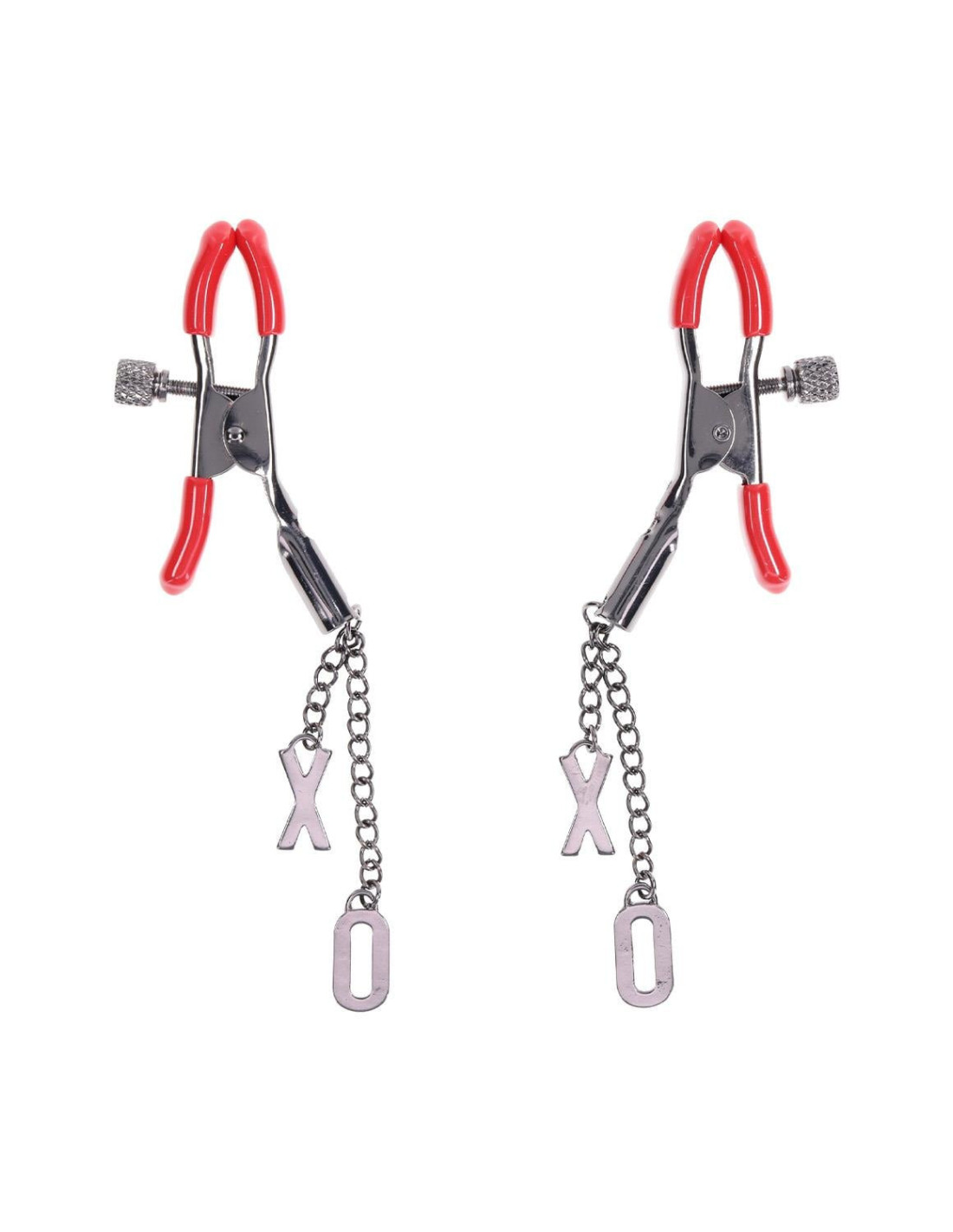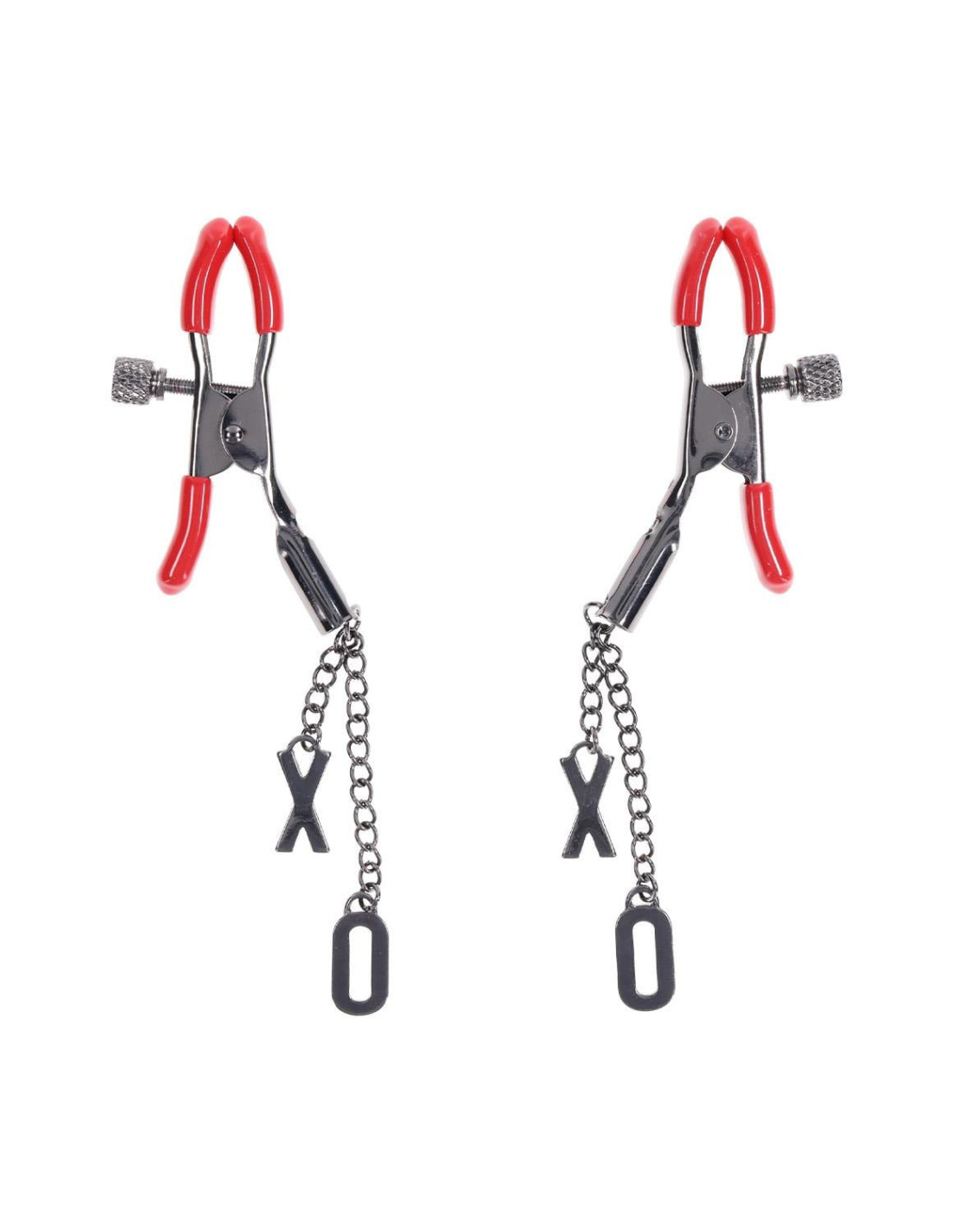 Indulge in a blend of pleasure and style with the Ex's & Oh's Nipple Clamps. These elegant gunmetal clamps feature soft red rubber tips designed for a comfortable yet tantalizing experience. Perfect for beginners and beyond, the adjustable tension offers customizable pressure, ensuring a perfect fit for any wearer. The dangling 'X' and 'O' charms add a playful touch to every moment, combining aesthetic appeal with functional allure. Whether for solo play or a shared experience, these nipple clamps are the perfect addition to your intimate collection, bringing a spark of excitement and sophistication.