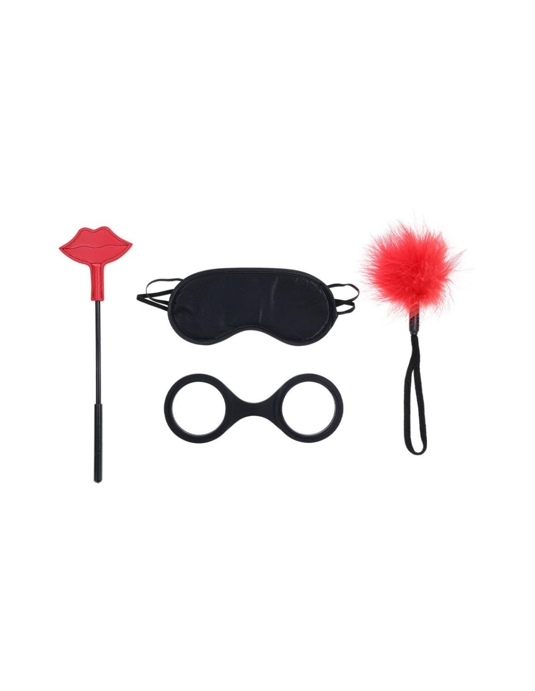 Unlock endless playful possibilities with the Ex's & Oh's Kiss Kit, the perfect set for anyone ready to explore sensual delights. Inside, you’ll find four enticing items to enhance your intimate moments: a silky satin blindfold to heighten anticipation, a mini faux leather crop featuring playful lips at the tip, and a feather tickler with a wrist strap to ignite your senses. The star of this kit is the 100% silicone cuffs. These stretchy cuffs allow you to quickly restrain your lover, while their flexible design lets them slip free when the moment calls. Whether you're in the mood for spontaneous fun or subtle on-the-go play, the Ex's & Oh's Kiss Kit is ready for a thrilling adventure. Are you? Satin blindfold with dual elastic fitting straps Secure silicone cuffs slide on and off for quick and easy play Travel easy with no metal to be detected Tap and tickle with the sweet lips crop and feather tickler Materials: Feather Tickler- 50% Feather, 30% PVC, 20% Polyester Blindfold- 80% Polyester, 20% PU Lips Crop- 60% PVC, 40% PU Cuffs- 100% Silicone