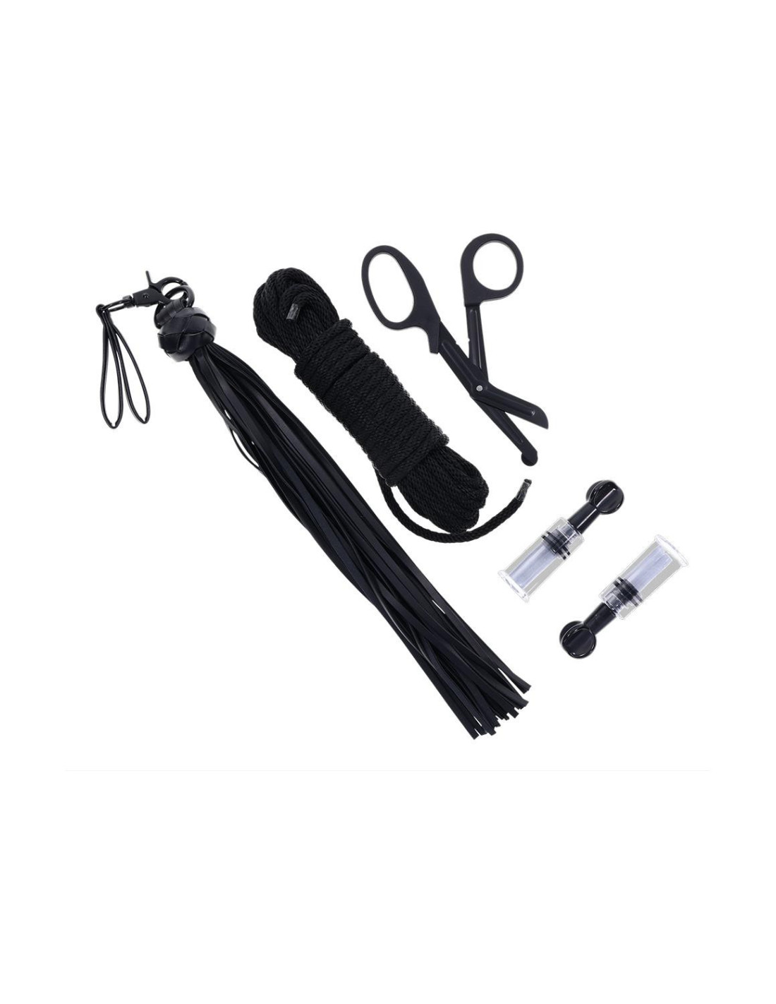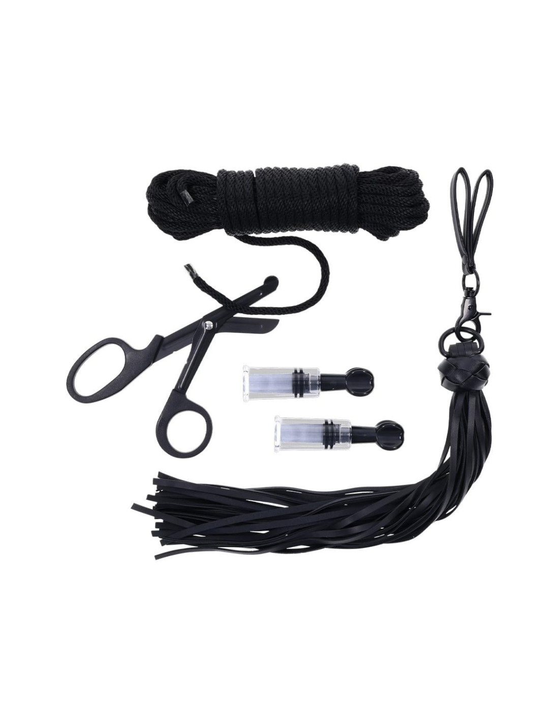 Master the art of dominance and guide your submissive partner through every exhilaratingly kinky scenario imaginable with the Tied and Twisted Bondage Kit. Explore the core principles of BDSM as you revel in your partners obedience. Learn to create seductive and captivating restraints with smooth, luxurious rope and practice punishments with the faux leather finger flogger. Keep their body sensitive to even the softest touch with the included nipple suckers, perfect to keep even the brattiest bottoms on edge.30 ft. (9,1 mtr) of black silky rope with metal end caps13' (33 cm) faux leather finger floggerDual nipple suckers with twist suction and rubber air sealSafety sheers includedMaterial: Stainless Steel / Polyester / Iron / Zinc Alloy / ABS / Acrylonitrile Styrene