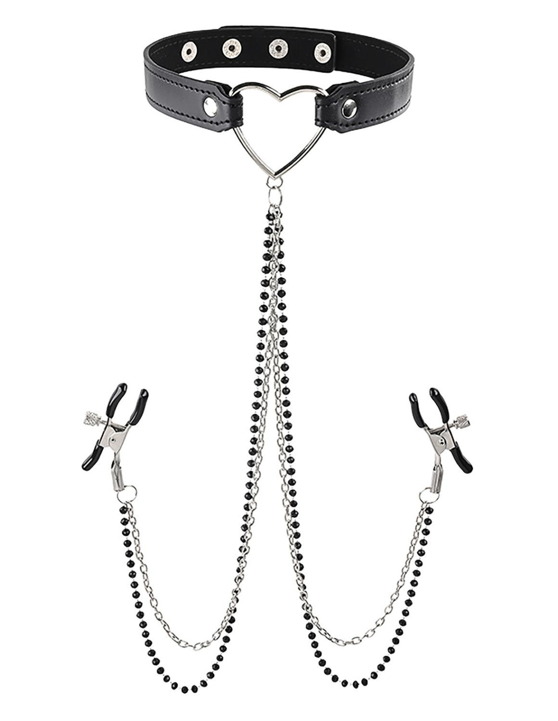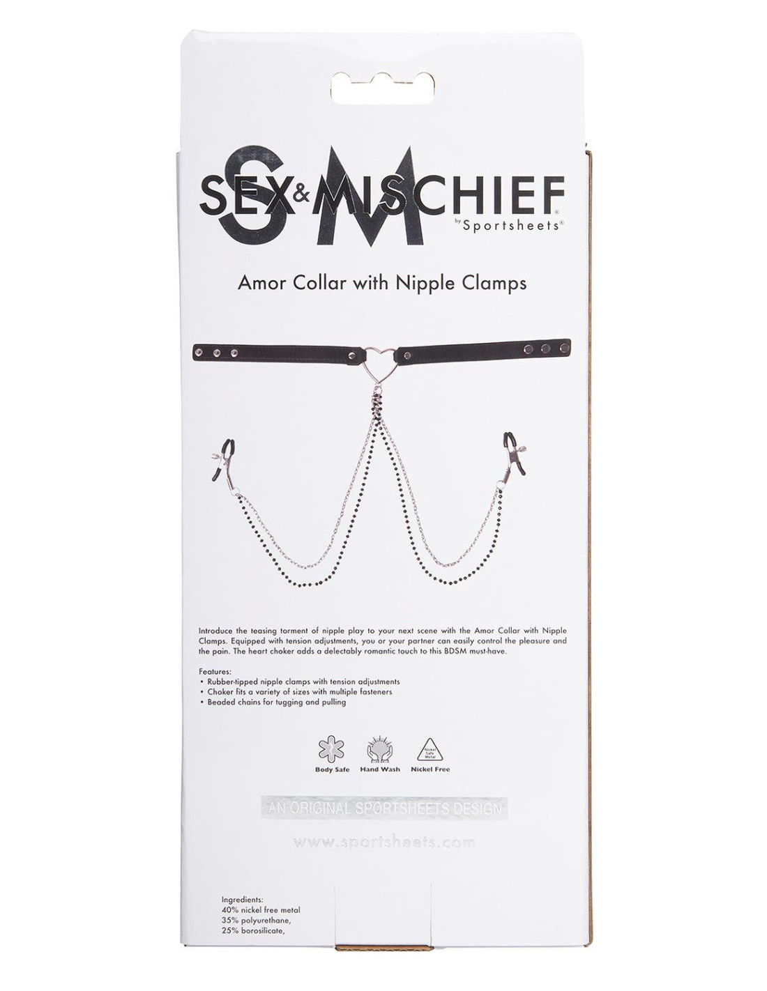 Introduce the teasing torment of nipple play to your next scene with the Amor Nipple Clamps. Equipped with tension adjustments, you or your partner can easily control the pleasure and the pain. The heart choker adds a delectably romantic touch to this BDSM must-have.Features:Rubber-tipped nipple clamps with tension adjustmentsChoker fits a variety of sizes with multiple fastenersBeaded chains for tugging and pullingMaterials: 40% Nickel free metal, 35% Polyurethane, 25% Borosilicate
