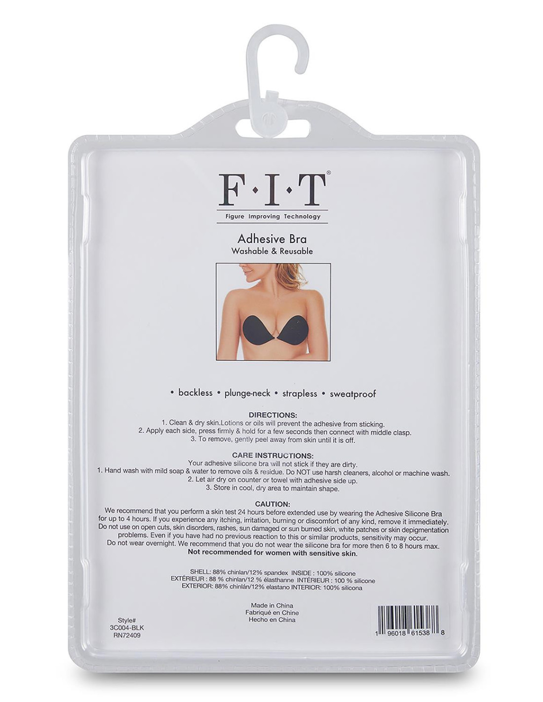 FIT (Figure Improving Technology) Cloth Adhesive Silicone Bra cup A, B, C or D, black, washable and reusable. Applicable for: BacklessPlunge-neckStraplessSweatproof Directions: Clean and dry skin. Lotions or oils will prevent the adhesive from sticking.Apply each side, press firmly and hold for a few seconds then connect with middle clasp.To remove, gently peel away from skin until it is off.Care Instructions: Your adhesive silicone bra will not stick if they are dirty.Hand wash with mild soap and water to remove oils and residue. Do not use harsh cleaners, alcohol or machine wash.Let air dry on counter or towel with adhesive side up.Store in cool, dry area to maintain shape.