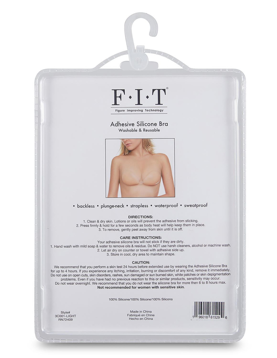 FIT (Figure Improving Technology) Adhesive Silicone Bra cup A, B, C or D, washable and reusable. Applicable for: BacklessPlunge-neckStraplessSweatproof Directions: Clean and dry skin. Lotions or oils will prevent the adhesive from sticking.Apply each side, press firmly and hold for a few seconds then connect with middle clasp.To remove, gently peel away from skin until it is off.Care Instructions: Your adhesive silicone bra will not stick if they are dirty.Hand wash with mild soap and water to remove oils and residue. Do not use harsh cleaners, alcohol or machine wash.Let air dry on counter or towel with adhesive side up.Store in cool, dry area to maintain shape.