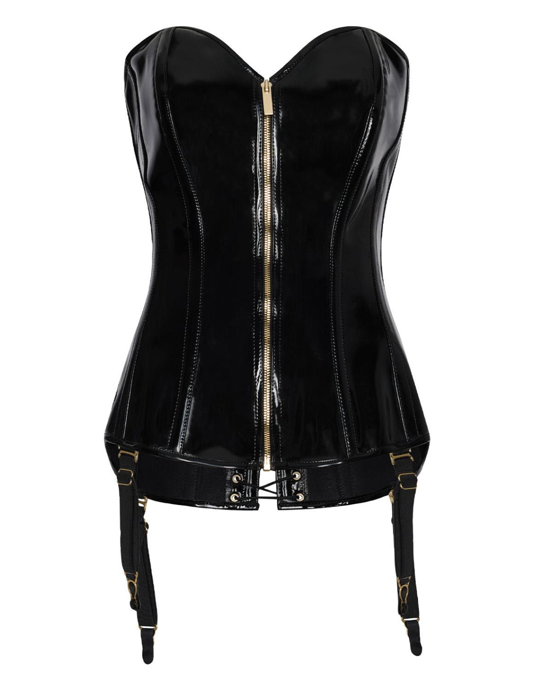 A bold gold front zipper creates a striking focal point and opens up possibilities for both styling and intrigue. At the back, lace-up detailing invites adjustable tension — shaping both the silhouette and the mood. Detachable straps give the wearer freedom to anchor the look or strip it back, offering versatility for any setting or intention.