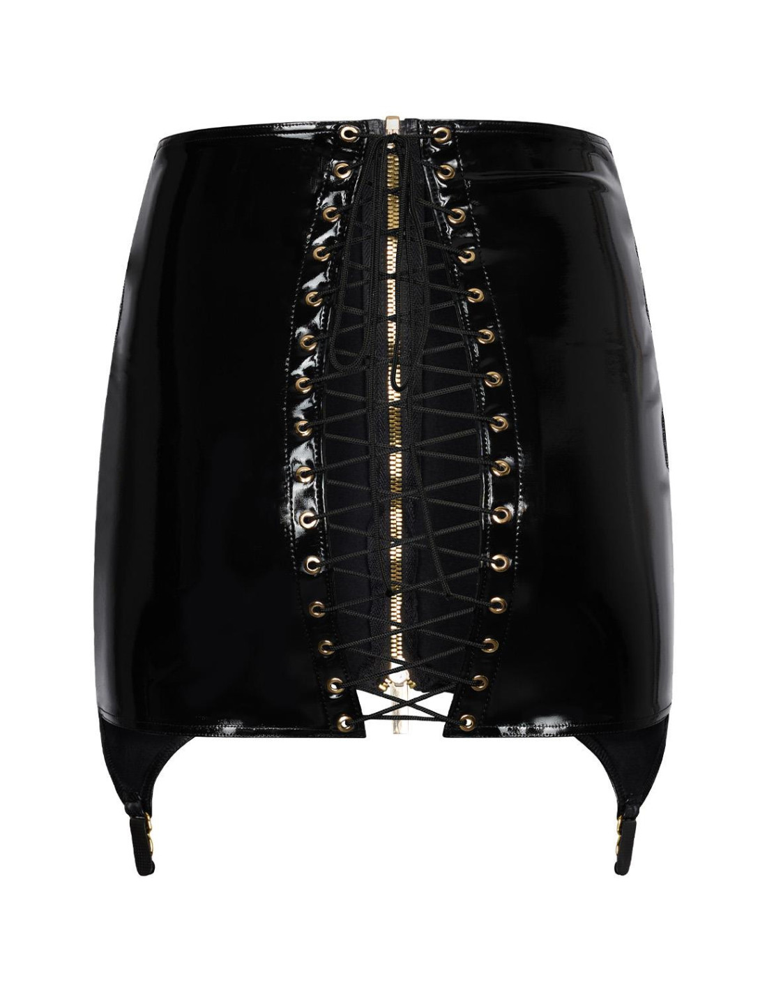 A gold-toned front zipper provides both style and seduction, offering a teasing reveal, while the lace-up back detail adds sensual drama and customizable fit. With a soft inner fabric for comfort and a figure-hugging shape, this skirt is perfect for customers who demand fashion that moves with them — and never goes unnoticed.