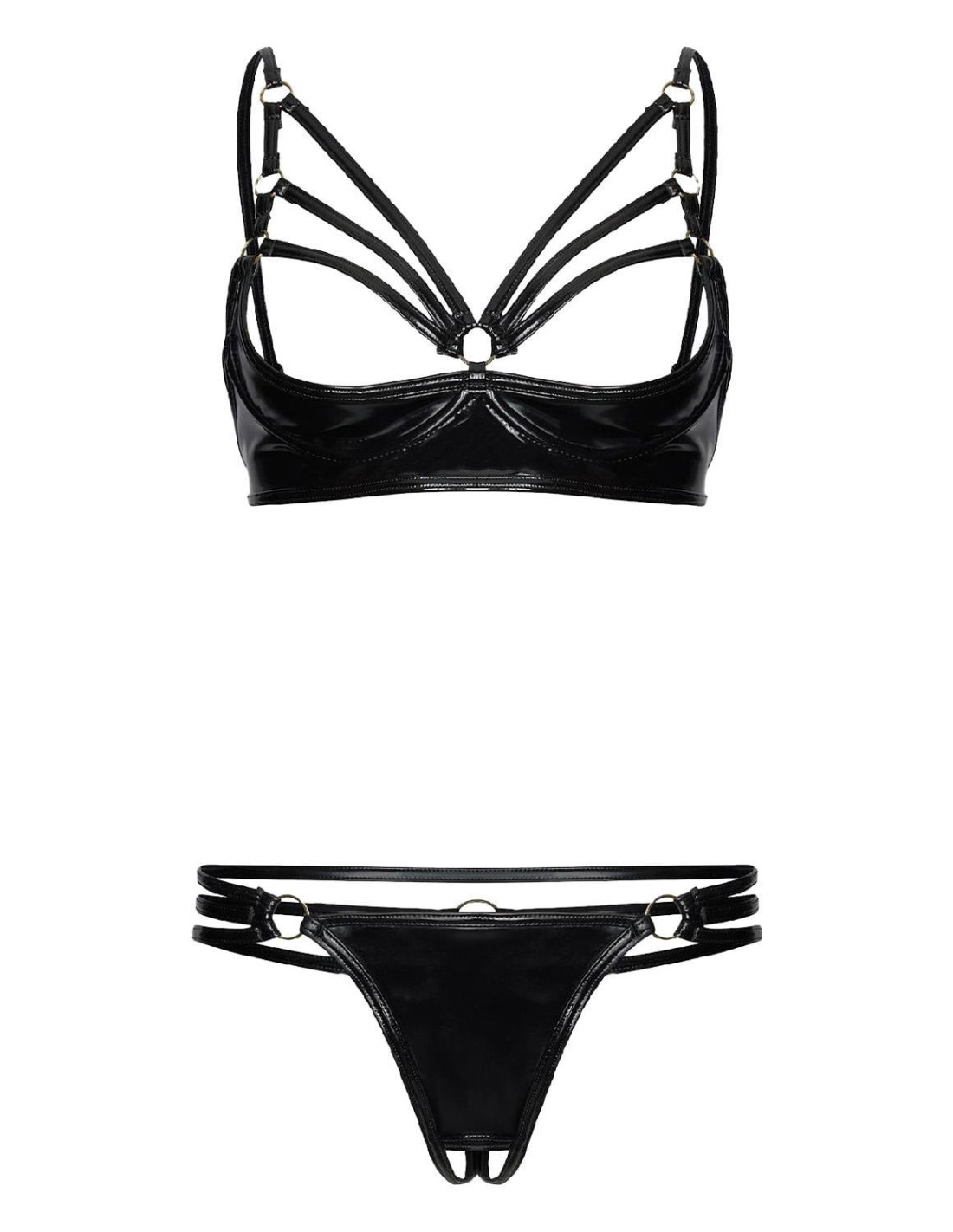 The strappy half-cup bra artfully frames the bust, offering visual intrigue and a supportive yet revealing fit. Paired with a matching open-crotch string, this set is crafted to contour the body, enhancing natural curves while leaving a lasting impression.