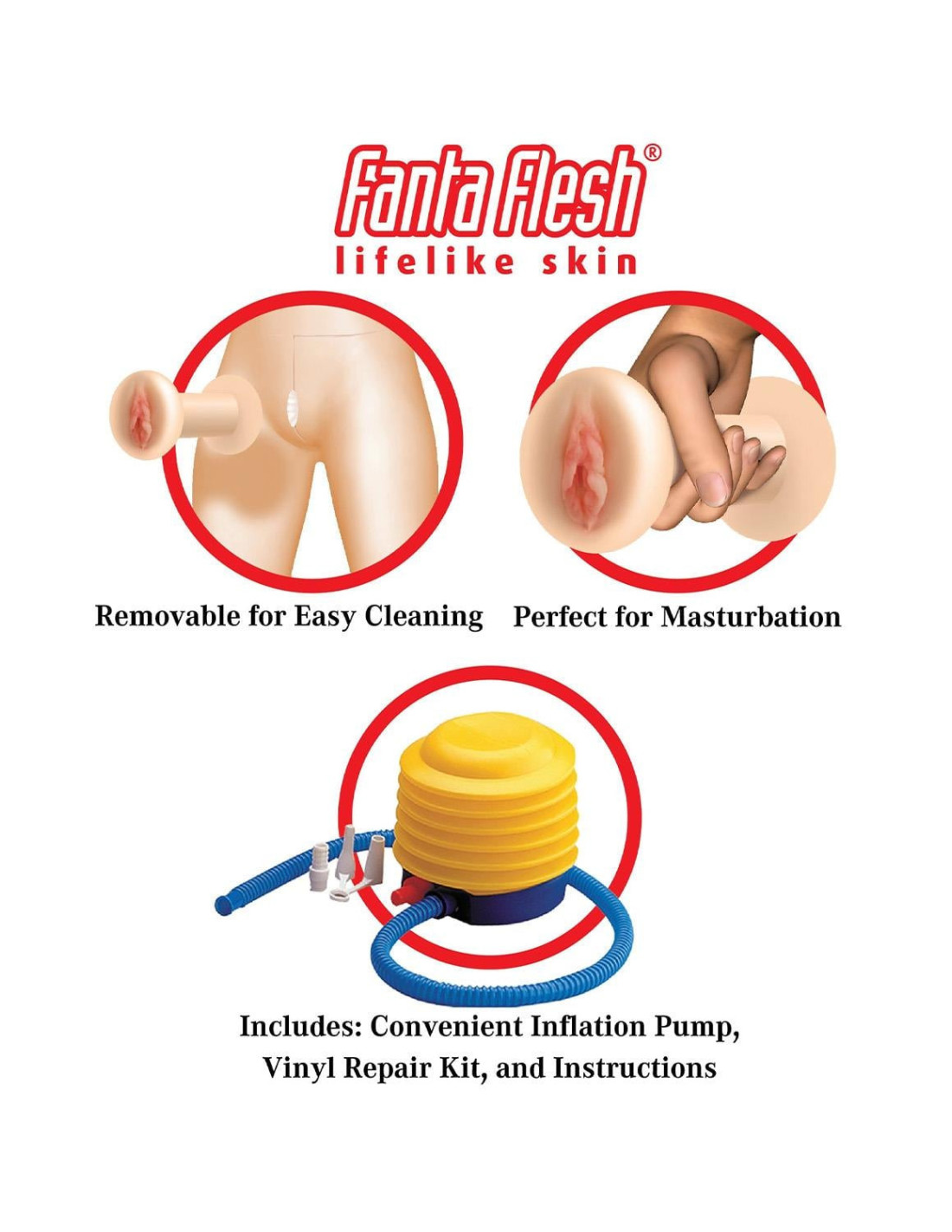 This incredible life-size B.J. Betty inflatable love doll was meticulously designed with realistic features for a truly lifelike experience. Her sexy 3D formed head features luxurious lifelike hair, realistic eyelashes, and an open mouth that's ready and willing to prove just how deep her throat can take it. Watch her really come to life with arms that swivel 360 degrees and delightfully painted finger and toenails. Give her firm and perky breasts a squeeze while you enjoy her ultra-lifelike Fanta Flesh® pussy, and ass that feels even better than the real thing! The Fanta Flesh pussy and ass are removable for easy in-depth cleaning, and can even be enjoyed separately for masturbation.
