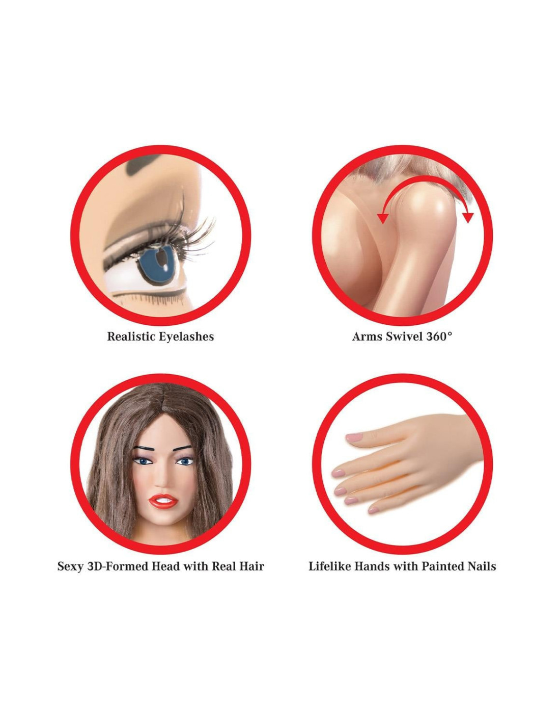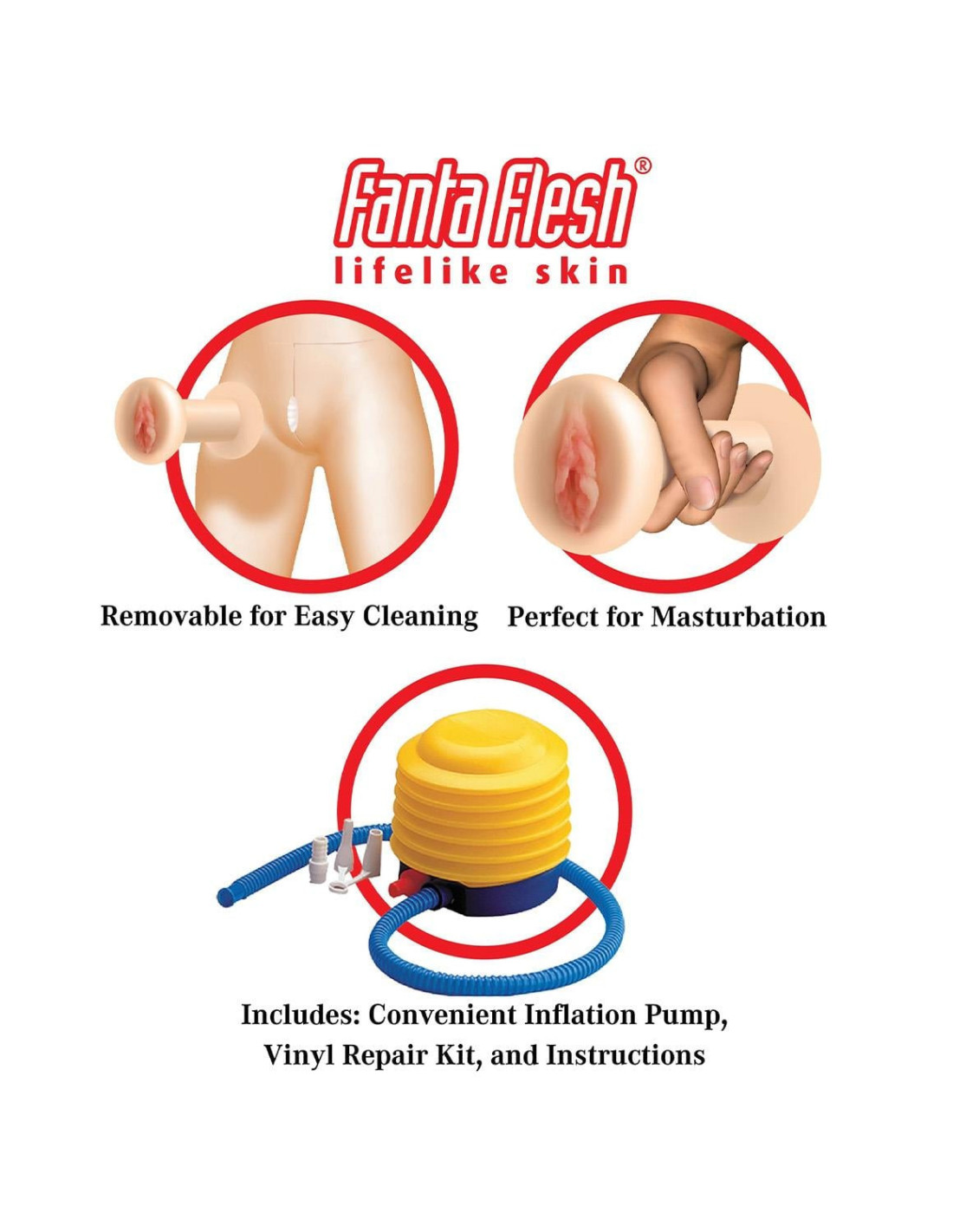 This incredible life-size inflatable love doll was meticulously designed with realistic features for a truly lifelike experience. Her sexy 3D formed head features realistic eyelashes and a luxurious head of real hair that's begging to be pulled! Watch her really come to life with arms that swivel 360 degrees and delightfully painted finger and toenails. Give her firm and perky breasts a squeeze while you enjoy her ultra-lifelike Fanta Flesh® skin, pussy, and ass that feels even better than the real thing! The Fanta Flesh pussy and ass are removable for easy in-depth cleaning, and can even be enjoyed separately for masturbation. An inflation pump, vinyl repair kit, and instructions are conveniently included.