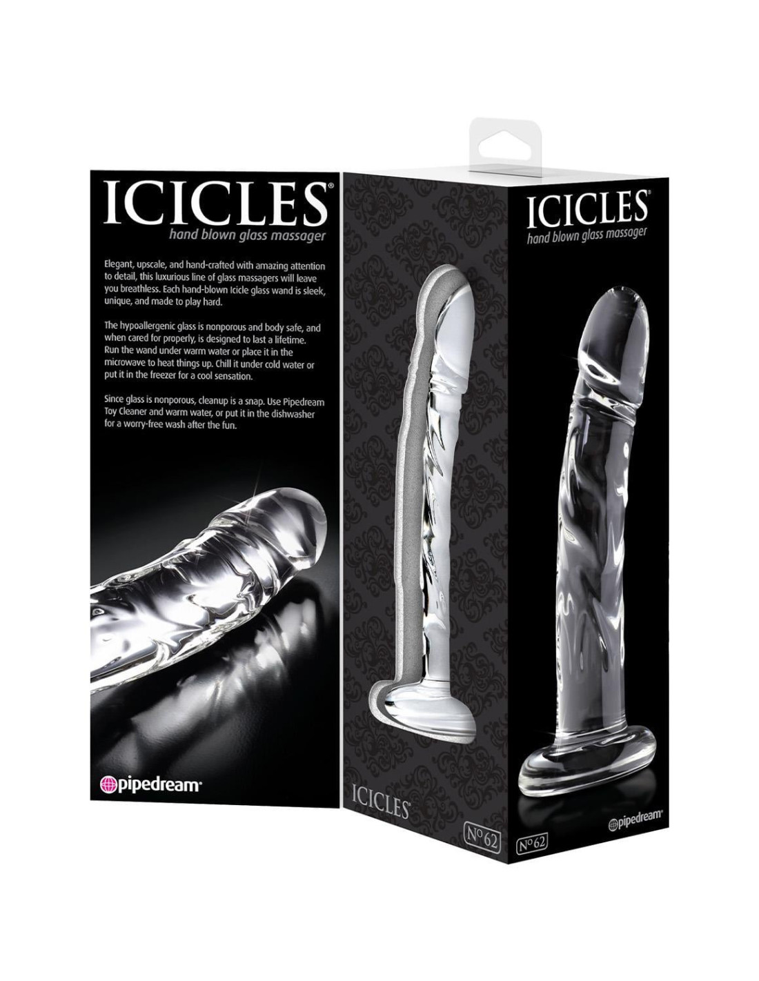 This luxurious glass massager No.62 features a tapered tip to ease insertion and a pronounced head that hits all the right spots. Cleverly curved for explosive G-Spot or P-Spot stimulation, the realistic veiny shaft offers additional stimulation, while the sturdy flat base ensures safe and easy handling. Featuring a wide, harness-compatible base, turn this into a unique strap-on with one of our Fetish Fantasy Series® harnesses. The hypoallergenic glass is nonporous and body safe, and when cared for properly, is designed to last a lifetime. ABOUT THE BRAND: Elegant, upscale, and hand-crafted with amazing attention to detail, this luxurious line of glass massagers will leave you breathless. Each hand-blown Icicle glass plug is sleek, unique, and made to play hard.
