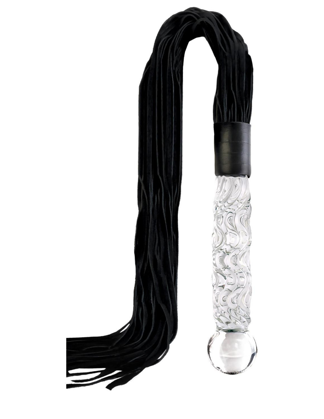 The glass Cat-O-Nine Tails features genuine bull leather tresses that are soft enough for beginner play but heavy enough to deliver a firm whack! The heavy-duty weighted glass handle is hand-blown and doubles as a glass dildo for vaginal or anal play. The beautiful textured swirls provide added stimulation, and the glass handle can be heated or cooled for tempting temperature play. Both practical and stylish, this gorgeous glass flogger is the perfect addition to any glass or fetish collection.