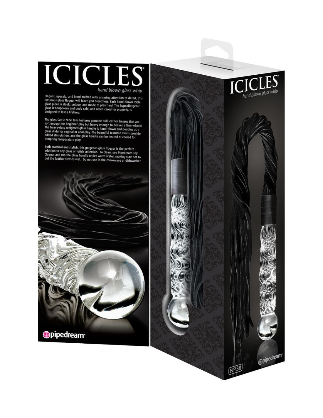 Elegant, upscale, and hand-crafted with amazing attention to detail, this luxurious glass flogger No.38 will leave you breathless. Each hand-blown Icicle glass piece is sleek, unique, and made to play hard. The hypoallergenic glass is nonporous and body safe, and when cared for properly, is designed to last a lifetime.