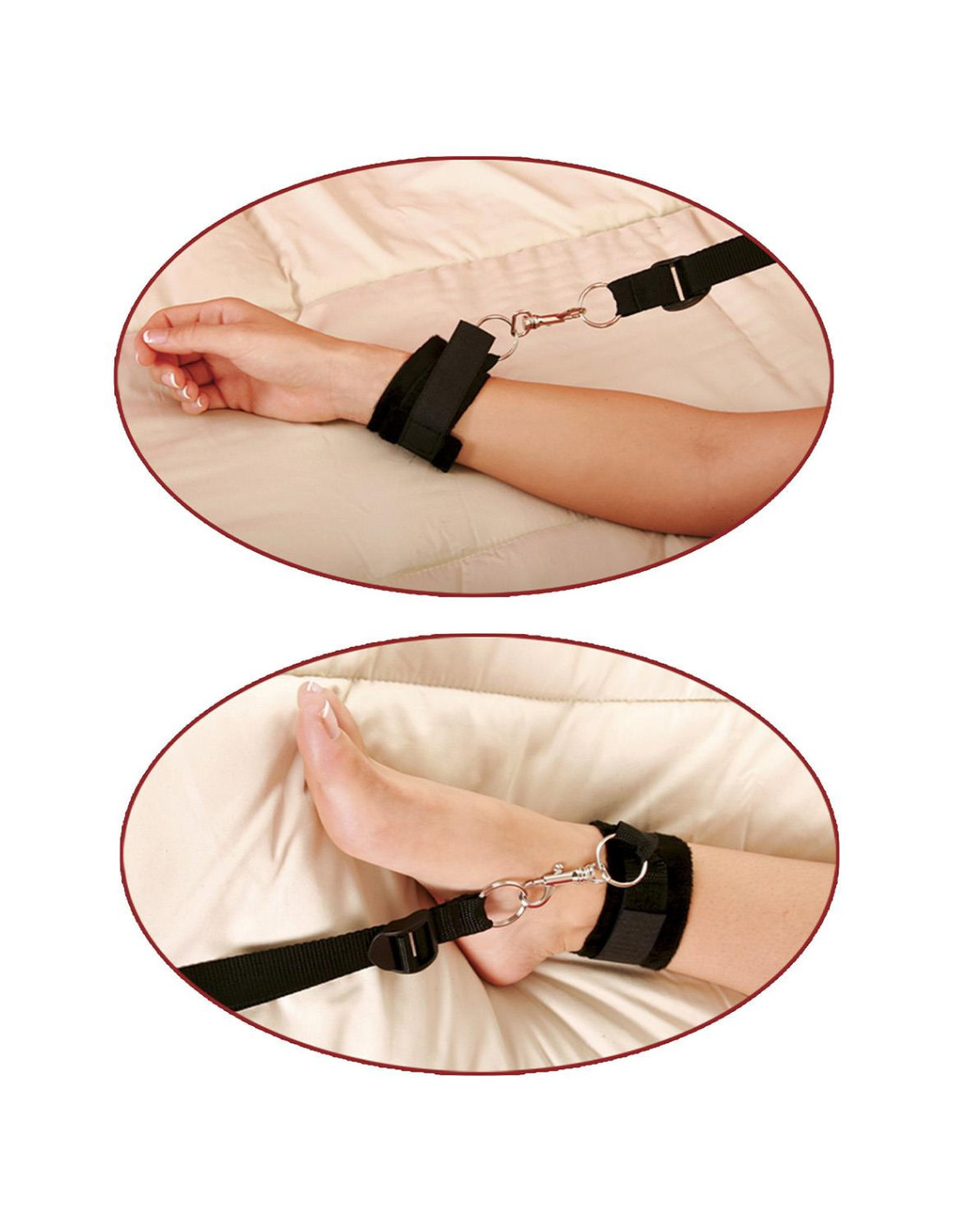The durable nylon tethers connect to 4 super soft neoprene-lined cuffs, which easily adjust to securely hold your partner in place. Explore your deepest fetish fantasies!