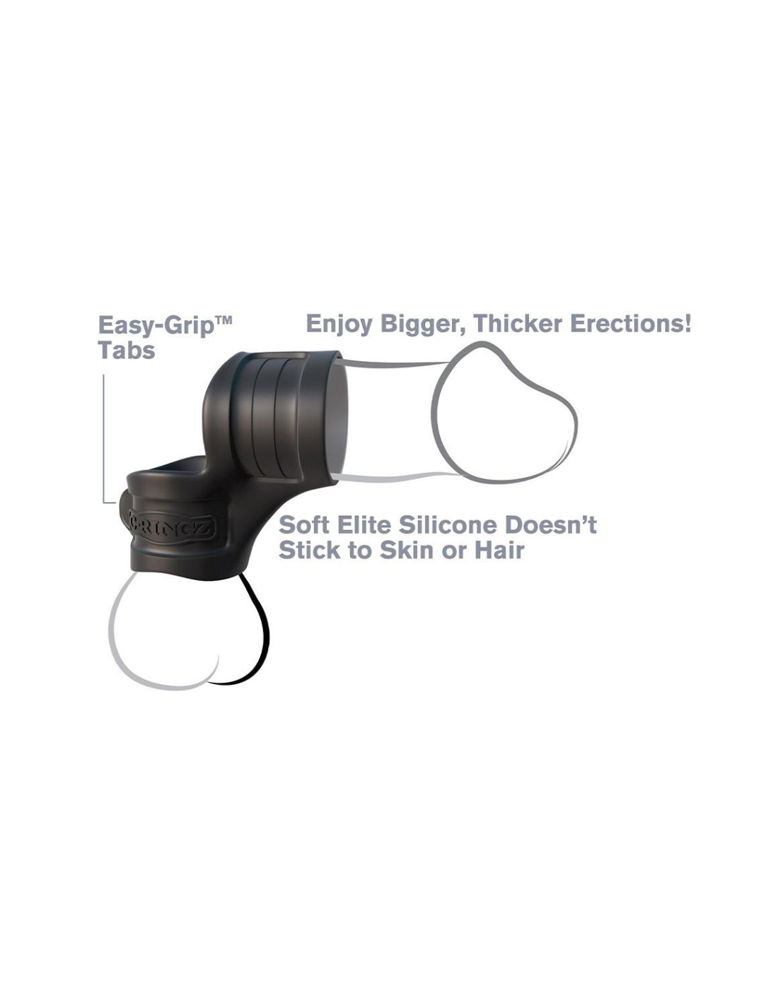 Climaxes will never be the same again when you're wearing this ring! You'll enjoy huge, hanging balls, throbbing erections, increased stamina, and explosive ejaculations. Grab the Easy-Grip tab and pull your balls through the bottom ring first, then stretch the top ring and slide it all the way to the base of your shaft.