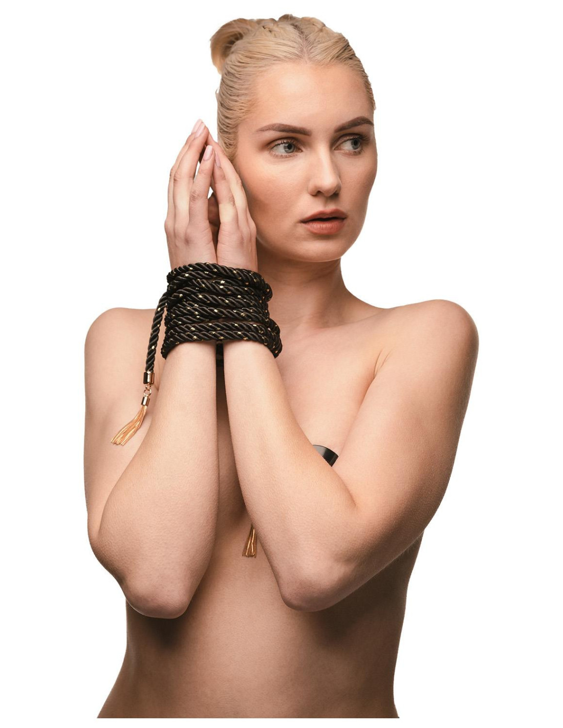 Designed for those who appreciate both form and function, the Embrace Rope 7M glides easily against the skin while maintaining enough structure for secure knots and reliable tension. Whether wrapped gently around wrists or shaped into a striking torso harness, each bind enhances connection and anticipation. The shimmering gold accents and elegant tassel ends elevate the rope from a simple restraint to an experience in itself—adding glamour to every twist and tie.