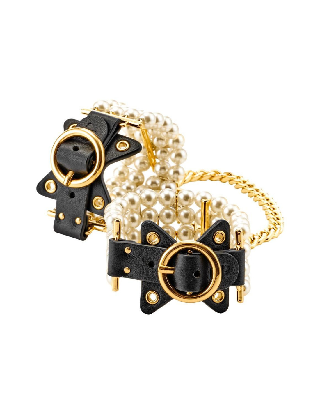 Each piece features signature faux pearl detailing and gold-toned hardware, creating a coordinated look that’s both elegant and impactful. Crafted from soft vegan leather, all items are designed for adjustable, secure, and skin-friendly wear. The set includes handcuffs, ankle cuffs, a collar with matching leash, a pearl-accented blindfold, a smooth silicone mouth gag, and a flexible paddle—delivering a full spectrum of sensation and control.