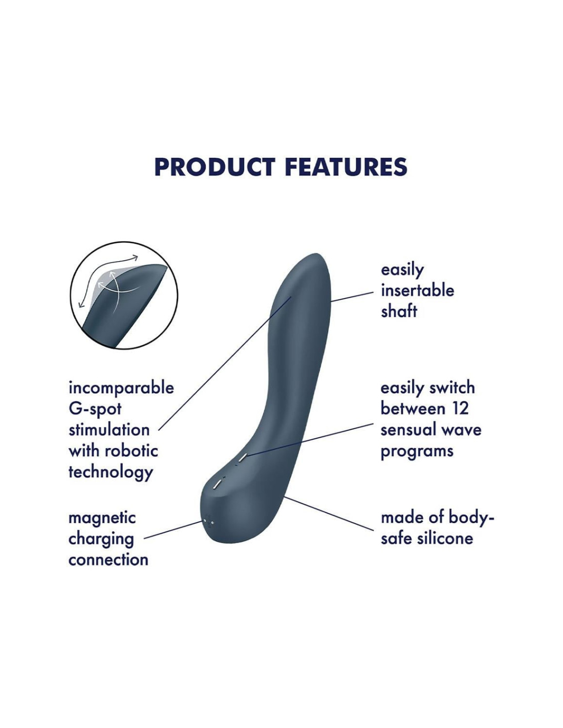 The future of sexual wellness is in your hands – and on your G-spot. The G-Spot Wave 4 features our new Robotic Technology, mimicking the sensation of a finger caressing the G-spot. The intense spiral wave motion will provide the most realistic experience.Incomparable G-Spot stimulation through robotic technologyMade from high-quality super-soft silicone that intensively transmits powerful vibrationsThanks to its waterproof (IPX7) finish, this toy can be used safely in water and is easy to cleanBody-friendly siliconeWaterproof (IPX7)12 programsWhisper modeRechargeable Li-ion batteryEasy to cleanUSB magnetic charging cable includedSatisfyer G-Spot Wave 4: Like a finger stroking the G-spotWith our Robotic Technology, we are taking sex tech to the next level. This technology creates spiral waves which feel like a real finger that caresses your most sensitive inner hot spot. Insert the shaft and choose your favorite setting: 12 spiral wave programs ranging from gentle strokes to heavy petting are waiting to be discovered. Thanks to the surface made of soft silicone, even the most powerful touch of the G-Spot Wave 4 still feels very tender. If you’re looking for something that feels like human touch, the G-Spot Wave 4 is the perfect device for you!The Future is WOW with the G-Spot Wave 4Thanks to the slightly pointed tip of its shaft, the G-Spot Wave 4 is easy to insert, making it a great device for people with little experience. With the slightly raised buttons, you can cycle through the different programs while focusing on enjoying your solo time with this G-spot vibrator. Waterproof (IPX7), the G-Spot Wave 4 can be fully submerged and is the ideal vibrator to join you in the shower or bathtub. After use, you can clean it with some water, soap, and toy cleaner, and easily give it back its power thanks to the rechargeable battery.