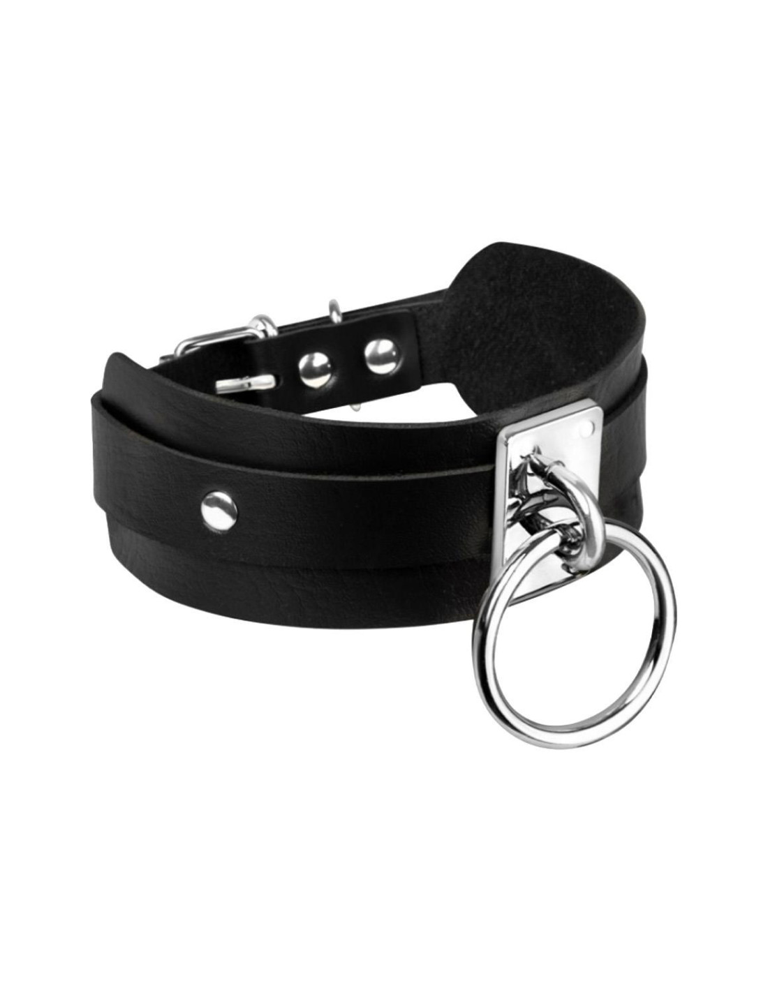 An erotic collar for exciting BDSM play sessions, but this collar can also certainly be worn as a fashion statement. The Vegan Leather O-ring collar is unisex. The ring at the front is supported by a steel plate and is a beautiful design element. The back is fully adjustable and fits effortlessly against your bare skin. Sex and Fashion at its best.Collar dimensions: 43.5 cm long, 4.5 cm wideRing dimensions: 4.5 cmMaterial: Vegan Leather, metalNumber of adjustable holes: 6The colours on the screen may differDownload the Kinky Diva Lookbook Kinky Collars