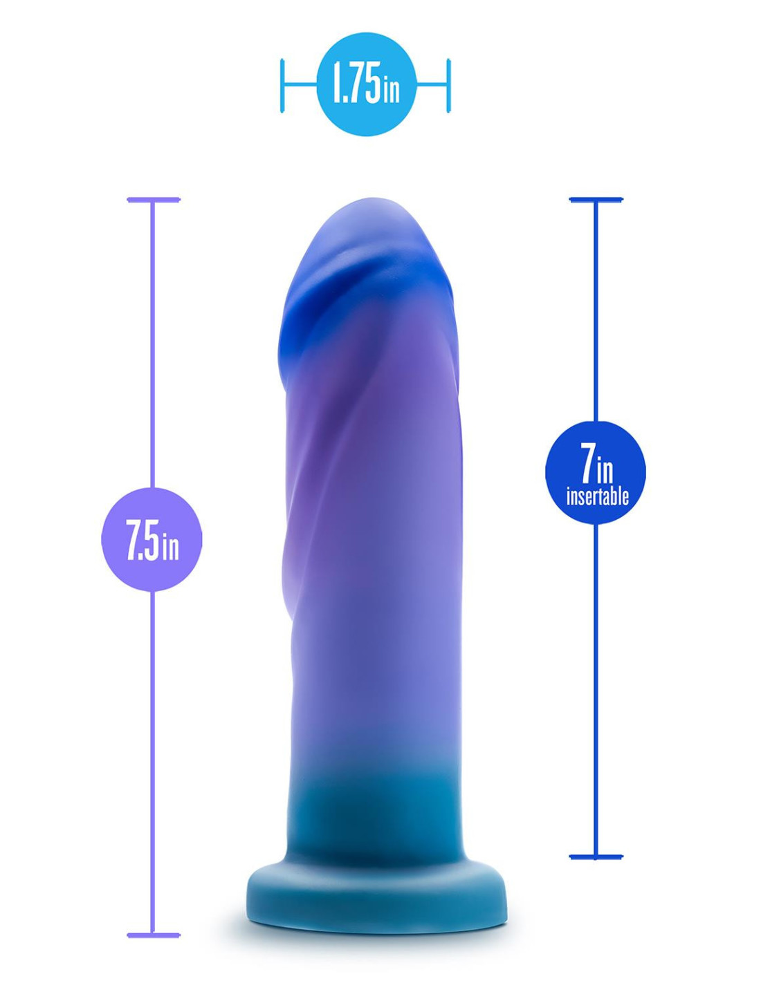Modern, stylish, and beautiful - Meet Avant Midnight Rendezvous! This artisanal dildo is hand sculpted with your utmost pleasure and comfort in mind, crafted with shades of blue and purple that brings you all the intimate feelings of a dark midnight sky. Avant Midnight Rendezvous flaunts a gracefully wide shaft, shaped with textured ridges and a broad head to maximize your G-spot and P-Spot pleasure during play. It’s crafted with Purio®, the finest platinum-cured liquid silicone and wrapped in satin smooth UltraSilk®, providing a supremely soft feel upon penetration. Avant is body-safe, free of phthalates, fragrances, latex, and paraffins. It’s also harness compatible with a strong suction cup base that opens a world of new fascinating possibilities for hands free play. Let Avant Midnight Rendezvous be your invitation to embrace the night and explore the depth of your passionate desires.Crafted with the finest Purio® platinum cured liquid siliconeWrapped in satin smooth Ultrasilk®Supremely soft and comfortableArtisanal handcrafted and thoughtfully designed for your pleasureStrong suction base and harness compatible for hands-free pleasureLength 7.75 inch / 19,7 cmInsertable length 7.25 inch / 18,4 cmWidth at its widest point 1.75 inch / 4,4 cm