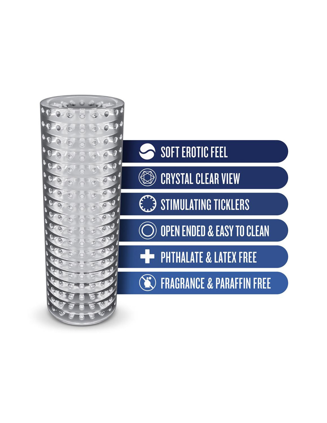 Sleek, modern, and loaded with sensation, the RIZE! Strokez sleeve features 5.25 inches of stimulating ticklers that cause waves of pleasure with each stroke. Turn it inside out and explore a smooth stroke too. Tight enough to cause pressure but soft and flexible enough for easy insertion. Use it with a water-based lubricant. Strokes is open-ended, easy to clean and contains no phthalates, paraffins, or latex. Super squishy softStimulating ticklers for optimal sensationsSqueezable to apply desired pressureChrystal clear to watch as you playSoft and ribbed feelSnug fitOpen ended and easy to cleanMade from TPEContains no phthalates, paraffins or latexLength 5.5 inch / 13,9 cmWidth 1.5 inch / 3,8 cm