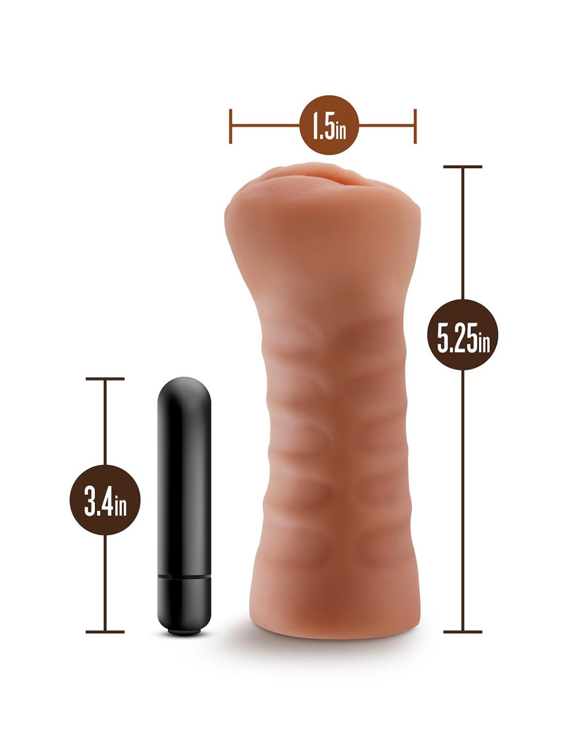 The M for Men Sofia is soft, open, and ready to play. This realistic stroker's canal is filled with sensational textures. It comes with a vibrating bullet, to enhance sensation as you stroke. Open-ended and easy to clean, Sofia will accommodate any size penis. Made of premium TPE, it's high-quality and body safe. Bullet vibe requires 1 AAA battery (not included).Soft, ribbed canal for the most lifelike experienceOne-speed bullet vibe to enhance sensation as you strokeThe open-ended sleeve will take any penis size and is easy to cleanMade from TPE, contains no fragrances, phthalates, paraffins, or latexRequires 1x AAA battery, not included.Length 5.25 inch / 13,3 cmWidth 1.5 inch / 3,8 cm