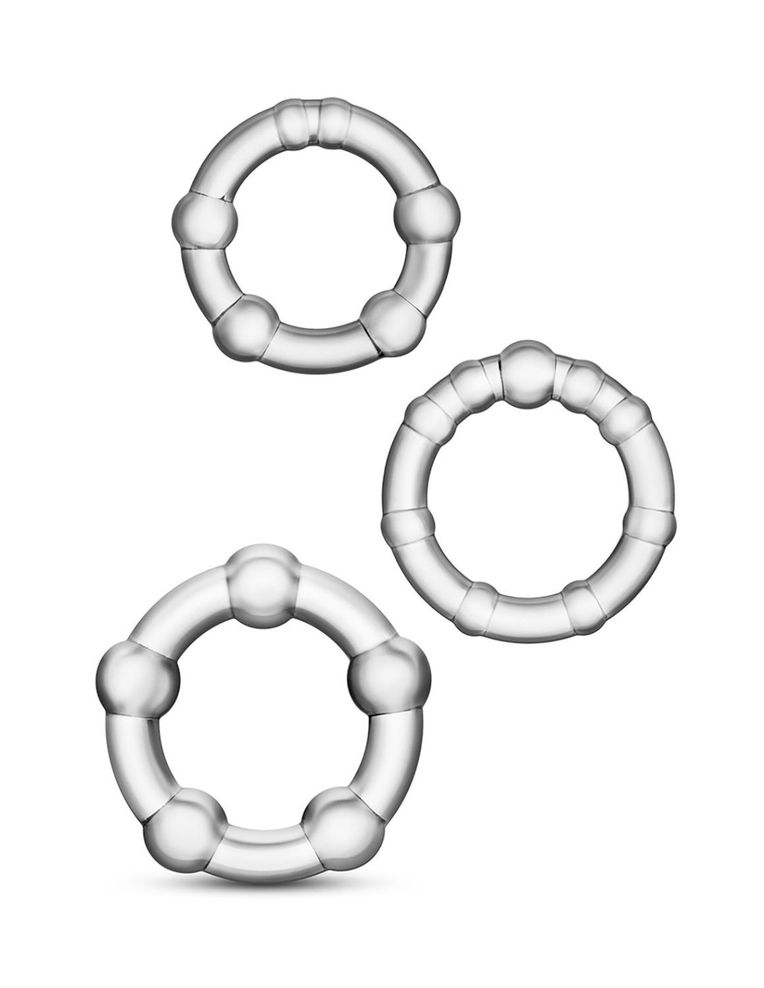 Perform like the stud you are! These Stay Hard Beaded Cock Rings come in 3 sizes, so you can use them individually or all 3 at once. The Small Ring is for maximum erections; Medium Ring is for hard erections; Large Ring can be used to encircle the upper part of your scrotum to help prevent premature ejaculation.They are made of body safe TPE, a super stretchy, comfortable and phthalate free material developed specifically for your safety and hygiene during your intimate play. So, if you're looking for a safe way to increase both in size and stamina, you and your partner are sure to enjoy Blush Novelties Stay Hard Beaded Cock Ring and your bigger, better erection that lasts even longer!Wash with soap and water between uses. Air dry. Stores best in the original packaging.3 Sizes beaded cockringsSuper elastic to fit any manSuper stretchy, comfortable and tear resistantUse them individually or 3 at onceA small ring for maximum erectionsMedium ring for hard erectionsLarge ring can be used to encircle the upper part of your scrotumVersatile super stretchy penis rings that can stretch more than 15x their original diameter. Get creative!Durable: made from high tensile strength TPE, tear resistantFor longer stronger harder bigger erectionsIncrease Stamina3 Sizes to fit everyone:1.25 inch / 3,1 cm1.3  inch / 3,3 cm1.5 inch / 3,8 cm