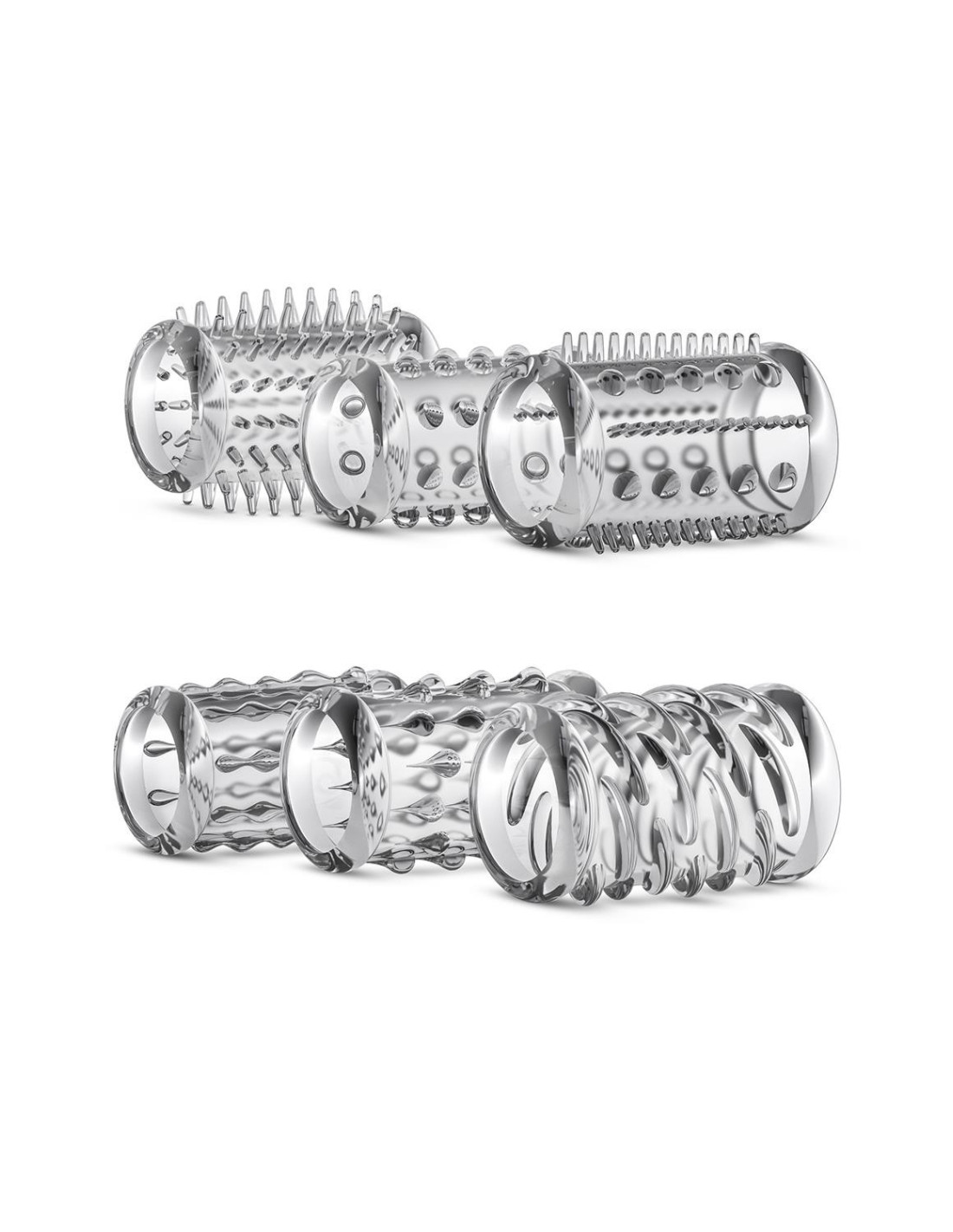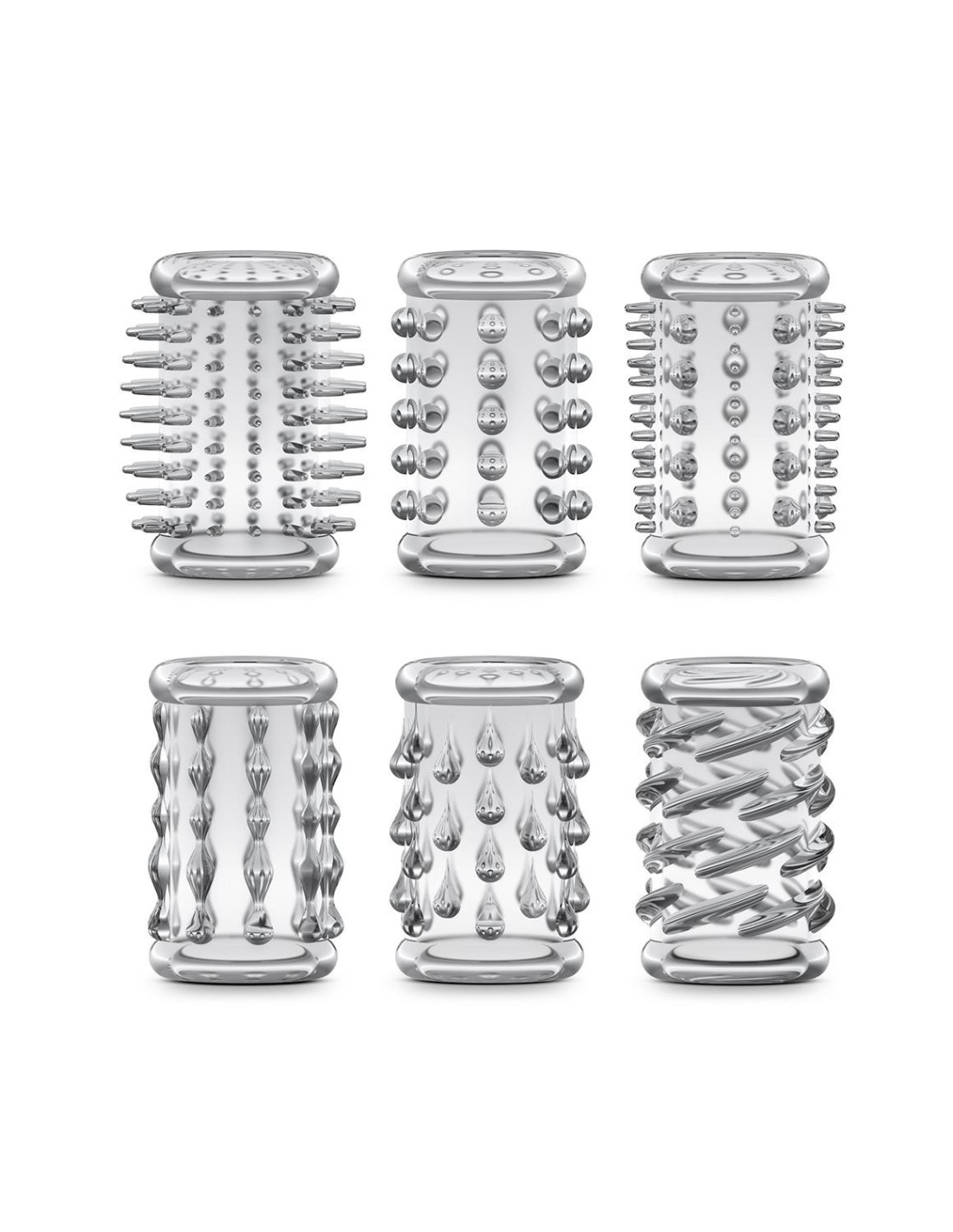 These stretchy enhancement sleeves are a simple way to add a new level of pleasure and sensation to your rod or favorite dildo. Just slide one of the sleeves over your shaft. Easy to use, and stays in place!Variety: 6 Unique textures to create new sensation in partner playTicklers: unique texture creates new sensations in partner playExplore: Use your sleeves alone or with a partnerStrong: High tensile strength creates ideal restriction and tear resistanceSize: Stretches to 1.57 inches (3,9 cm), one size fits most