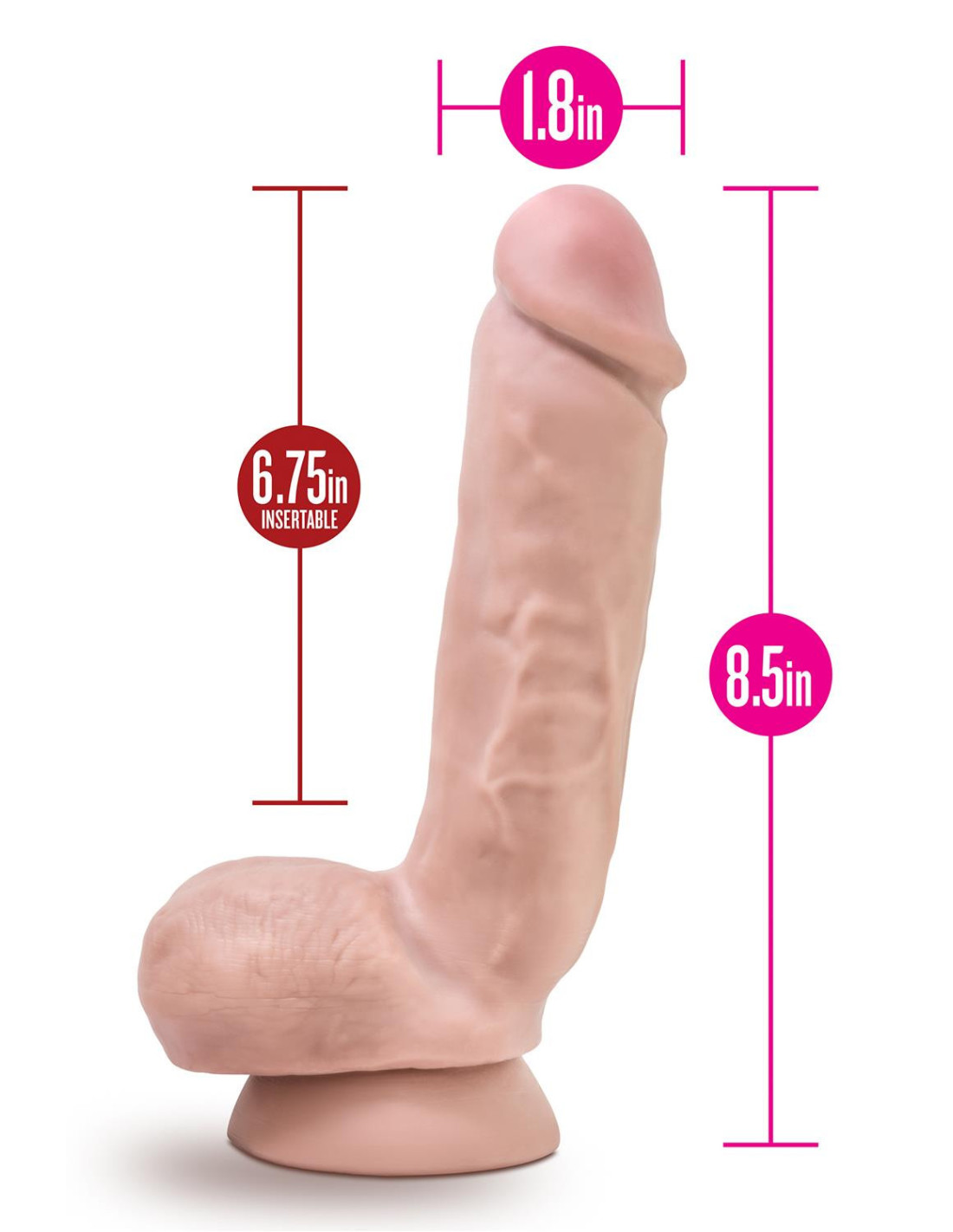 Measuring 8.5 inches, The X5 Hard On Realistic Dildo by Blush Novelties looks and feels like the real thing. It is made to please and satisfy even the most discriminating of dildo connoisseurs. The suction cup makes the Hard On harness compatible and is built for the cowboy or cowgirl in you, while the fleshy balls provide a cushion for a wild ride. Giddy Up! You can also suction this to any flat surface, headboard/footboard, shower door/wall, or even explore with a sturdy mirror! This Hard On is phthalate, fragrance and latex free, it's made out of X5 a unique material with superior properties that feels real and even warms to the touch. It is safe for all skin types even the most sensitive ones. The flexible shaft, firm yet pliant makes this an excellent sex toy for vagina, g-spot exploration in women or prostate massage in men and is thick enough to satisfy the most demanding lover. Get your ultimate Hard On today!Soft and flexible, feels realistic and will fill you up.Hand sculpted shape is both pleasing to the eye and works very well at inducing orgasmsStrong suction cup base sticks well to almost any smooth flat surfaceLength 8.5 inch / 21,5 cmInsertable length 6.75 inch / 17,1 cmWidth 1.8 inch / 4,5 cmClick here for the vibrating version