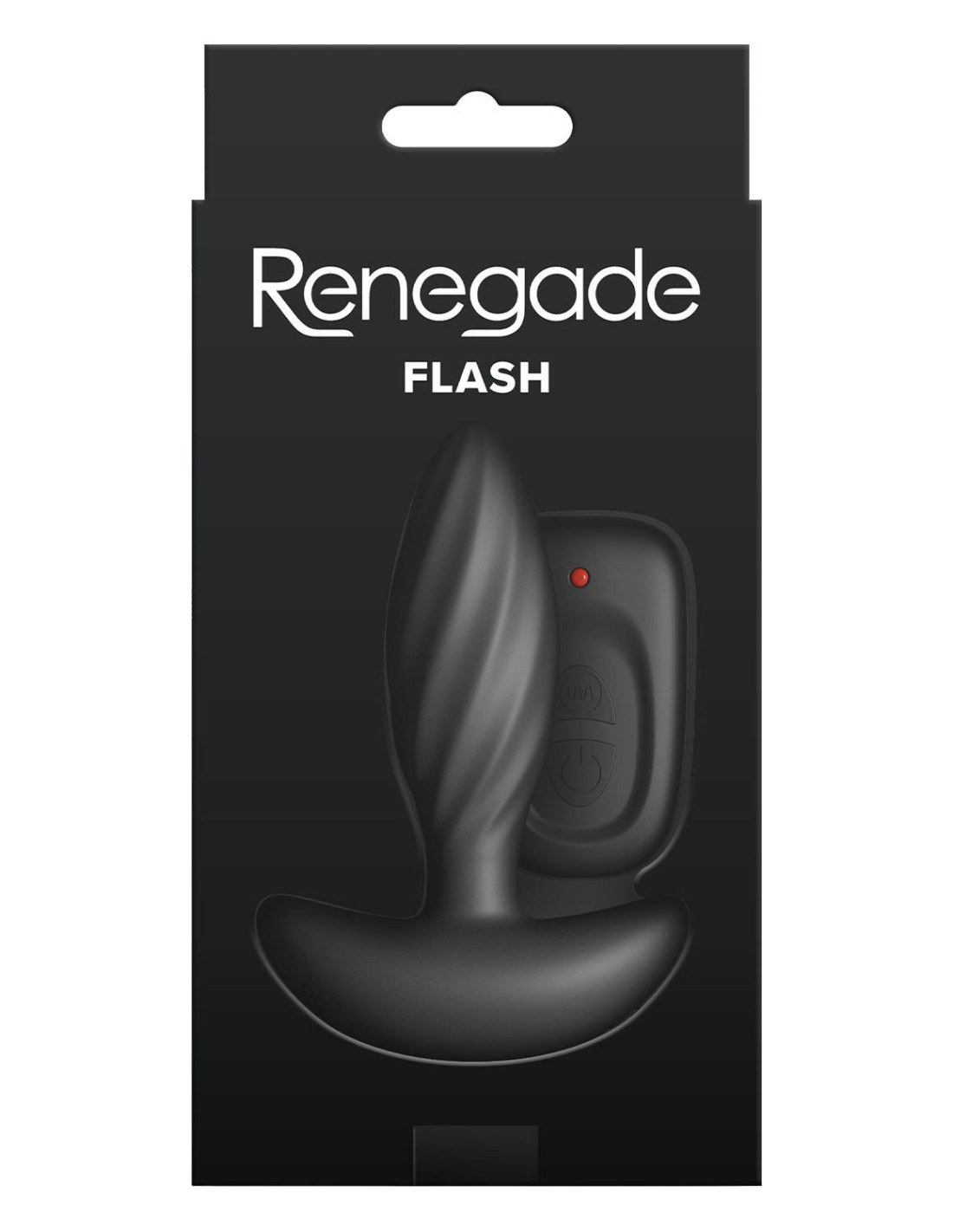 Renegade Flash is a vibrating anal plug with a ribbed design for enhanced stimulation. Featuring a contoured shape, powerful motor, and wireless remote control, Flash is designed for maximum pleasure and comfort. Rechargeable and water-resistant. Compatible with all lubricants. Includes a CR2032 battery for the remote. 3 speeds / 13 functions.Vibrating anal plugPowerful motor3 Vibration speeds / 13 functionsWireless remote controlRechargeable plugWater-resistantRemote includes a CR2032 batteryCompatible with all lubricantsProduct Dimensions:Vibe: 4.06 x 2.64 x 1.38 inch / 10,3 x 6,7 x 3,5 cmRemote: 2.24 x 1.34 x 0.60 inch / 5,7 x 3,4 x 1,5 cmInsertable Dimensions: 3.15 x 1.06 inch / 8,0 x 2,7 cmProduct Material: SiliconeCharger type: USB-MagnetCharge time: 90 minutesRun time: 60 minutes