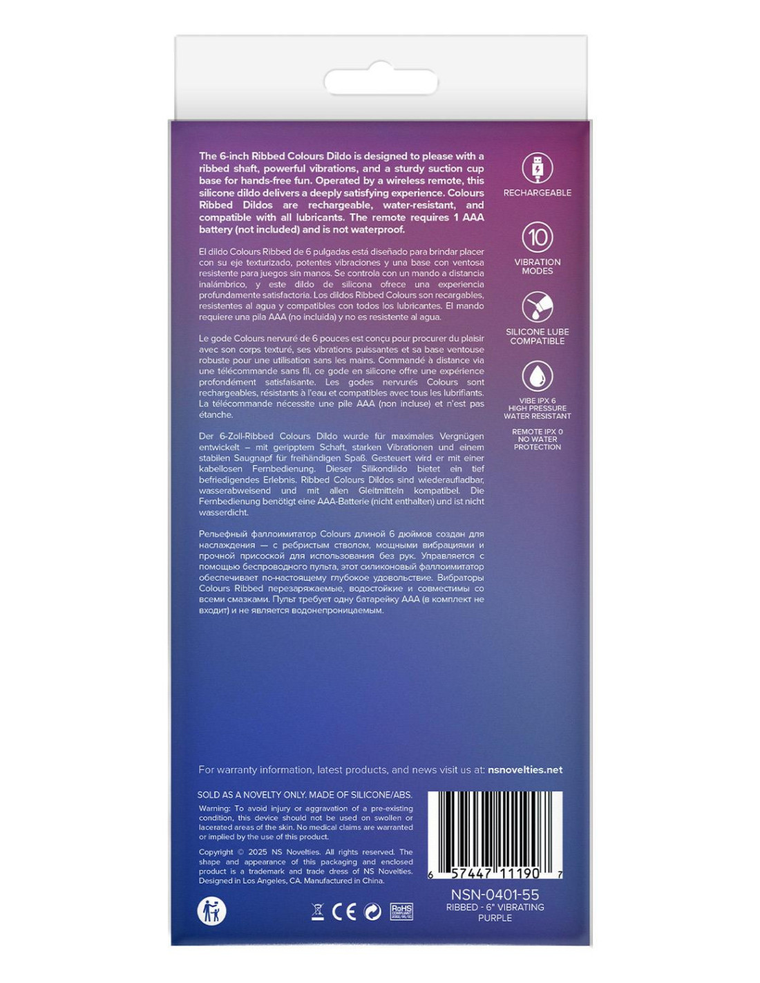 Ribbed dildo10 Powerful vibratonsSuction cup baseWireless remote Rechargeable dildoRemote requires 1 AAA battery (not included)IPX6 water-resistant dildoCompatible with all lubricantsProduct Dimensions:Vibe: 6.5 x 2.95 x 2.95 inch / 16,5 x 7,5 x 7,5 cmRemote: 2.95 x 1.38 x 0.98 inch / 7,5 x 3,5 x 2,5 cmInsertable Dimensions: 5.98 x 1.54 inch / 15,2 x 3,9 cmProduct Material: SiliconeCharger type: USB-PinCharge time: 80 minutesRun time: 40 minutes