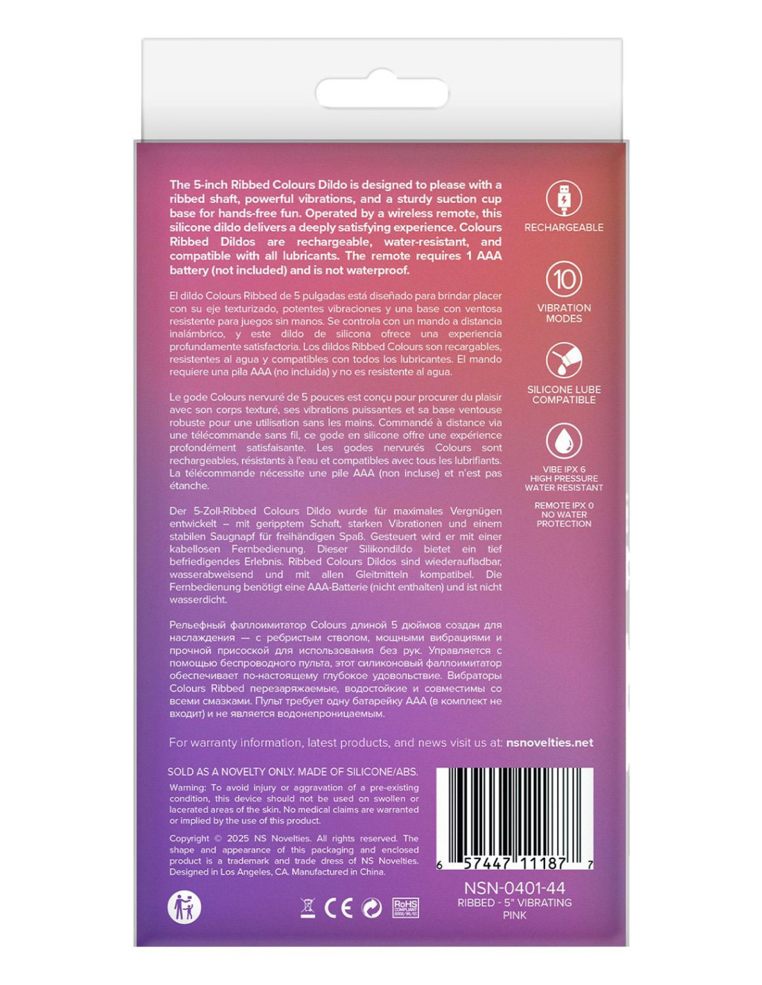 The 5-inch Ribbed Colours Dildo is designed to please with a ribbed shaft, powerful vibrations, and a sturdy suction cup base for hands-free fun. Operated by a wireless remote, this silicone dildo delivers a deeply satisfying experience. Colours Ribbed Dildos are rechargeable, water-resistant, and compatible with all lubricants. The remote requires 1 AAA battery (not included) and is not waterproof.Ribbed dildo10 Powerful vibratonsSuction cup baseWireless remote Rechargeable dildoRemote requires 1 AAA battery (not included)IPX6 water-resistant dildoCompatible with all lubricantsProduct Dimensions:Vibe: 5.71 x 2.95 x 2.95 inch / 14,5 x 7,5 x 7,5 cmRemote: 2.95 x 1.38 x 0.98 inch / 7,5 x 3,5 x 2,5 cmInsertable Dimensions: 5.12 x 1.34 inch / 13,0 x 3,4 cmProduct Material: SiliconeCharger type: USB-PinCharge time: 80 minutesRun time: 40 minutes
