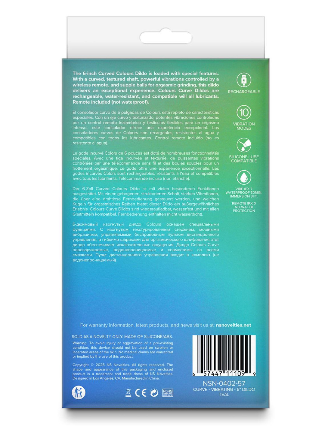 The 6-inch Curved Colours Dildo is loaded with special features. With a curved, textured shaft, powerful vibrations controlled by a wireless remote, and supple balls for orgasmic grinding, this dildo delivers an exceptional experience. Colours Curve Dildos are rechargeable, water-resistant, and compatible will all lubricants. Remote included (not waterproof).Rechargeable10 Vibration modesVibe IPX7Remote not waterproofProduct material: SiliconeDimensions:Toy: 6.46 x 2.2 x 3.54 inch / 16,4 x 5,6 x 9 cmRemote: 2.32 x 1.57 x 0.55 inch / 5,9 x 4 x 1.4 cmInsertable dimensions: 5.71 x 1.54 inch / 14,5 x 3,9 cmCharger type: USB-PinCharge time: 90 minutesRun time: 60 minutes