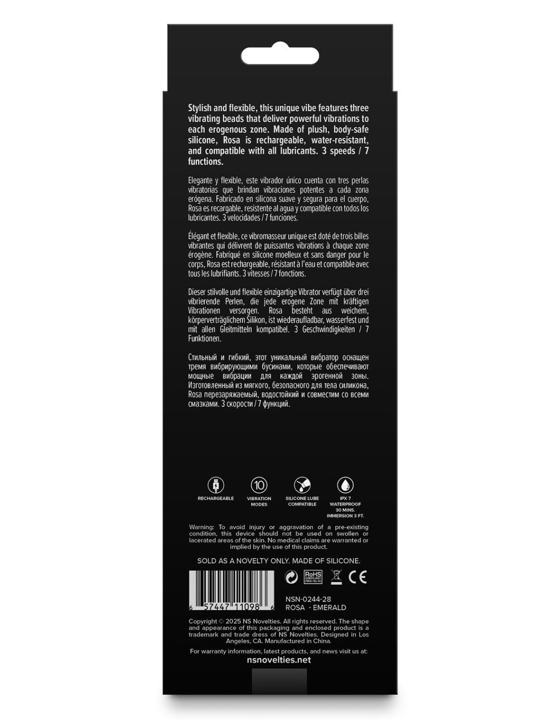 Stylish and flexible, this unique vibe features three vibrating beads that deliver powerful vibrations to each erogenous zone. Made of plush, body-safe silicone, Rosa is rechargeable, water-resistant, and compatible with all lubricants.3 speeds / 7 functionsRechargeableIPX Rating: IPX7