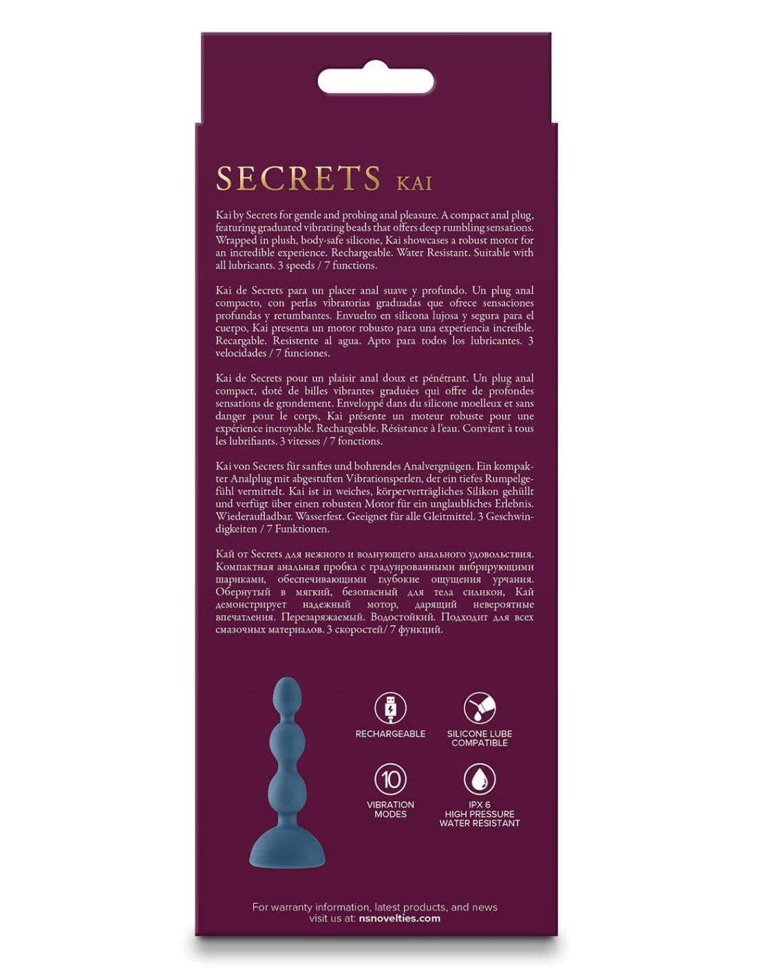 Kai by Secrets for gentle and probing anal pleasure. A compact anal plug, featuring graduated vibrating beads that offers deep rumbling sensations. Wrapped in plush, body-safe silicone, Kai showcases a robust motor for an incredible experience. Rechargeable. Water Resistant. Suitable with all lubricants. Elevate your anal play with Kai by Secrets, a compact anal plug designed for gentle yet thrilling pleasure. Featuring graduated vibrating beads wrapped in plush, body-safe silicone, Kai delivers deep rumbling sensations for an incredible experience. With 3 speeds and 7 functions, this rechargeable, water-resistant plug allows for a customized exploration of anal pleasure. Compatible with all lubricants, Kai ensures both safety and satisfaction in every encounter.Compact vibrating anal plugGraduated beads for deep pleasure3 speeds and 7 functionsPlush body-safe siliconeRechargeable and water-resistantRobust motorDimensions: 5.67 x 2.32 x 1.5 inch / 14,4 x 5,9 x 3,8 cmInsertable Dimensions: 4.57 x 1.18 inch / 11,6 x 3 cmMaterial: SiliconeSuitable with all lubricantsCharger type: USB-PinCharge time: 120 minutesRun time: 90 minutes