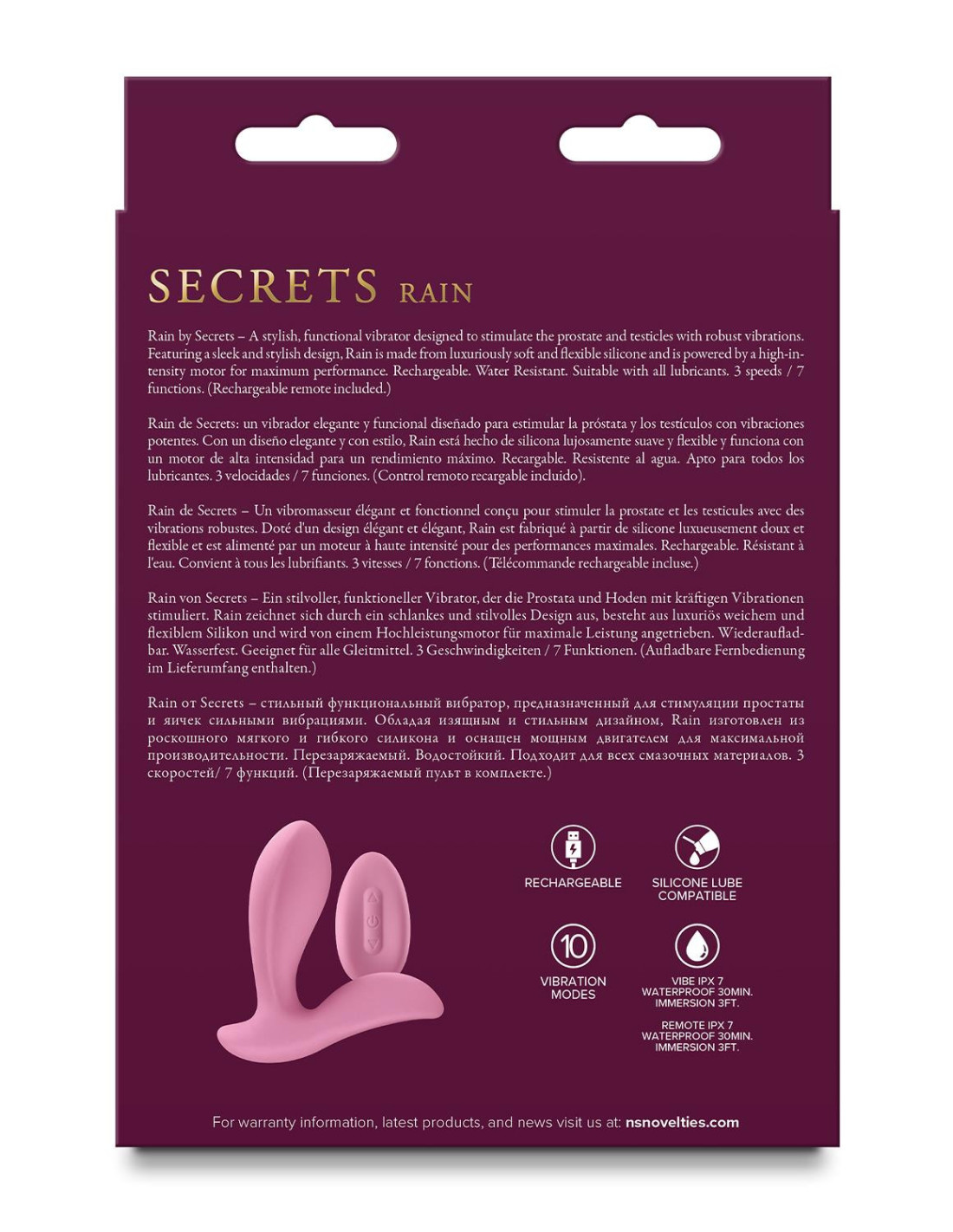 Rain by Secrets – A stylish, functional vibrator designed for robust vibrations. Featuring a sleek and stylish design, Rain is made from luxuriously soft and flexible silicone and is powered by a high-intensity motor for maximum performance. Rechargeable. Water Resistant. Suitable with all lubricants.Experience exceptional pleasure with Rain by Secrets, a sleek vibrator crafted for intense sensations. Designed with a high-intensity motor and made from luxuriously soft, flexible silicone, Rain delivers robust vibrations for a satisfying experience. Its stylish, ergonomic design ensures comfortable use and maximum performance. Featuring 3 speeds and 7 functions, Rain is perfect for both solo and partner play. Rechargeable and water-resistant, Rain is suitable with all lubricants, making it a versatile and body-safe choice for your erotic adventures. (Rechargeable remote included.)High-intensity motor for robust vibrations3 speeds and 7 functionsLuxurious soft silicone constructionRechargeable with remote includedWater-resistant and lubricant-friendly3 speeds / 7 functionsDimensions: 4.45 x 4.13 x 1.38 inch / 11,3 x 10,5 x 3,5 cmInsertable Dimensions: 3.58 x 1.38 inch / 9 x 3,5 cmMaterial: SiliconeCharger type: USB-PinCharge time: 90 minutesRun time: 55 minutes