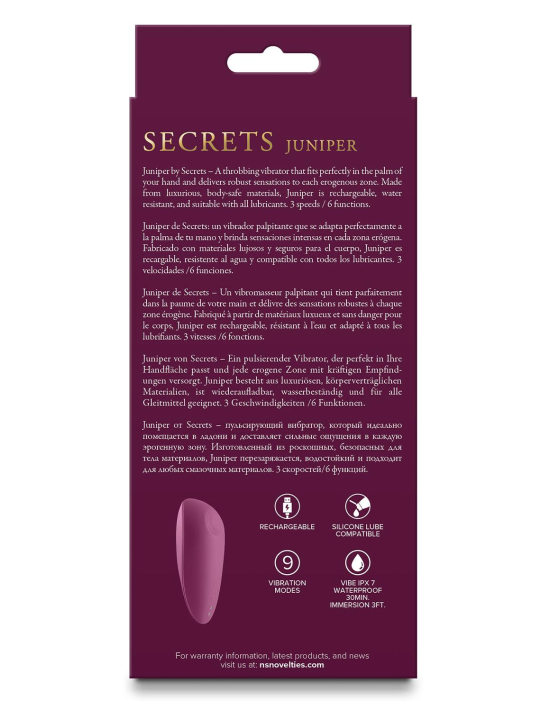 Juniper by Secrets – A throbbing vibrator that fits perfectly in the palm of your hand and delivers robust sensations to each erogenous zone. Made from luxurious, body-safe materials, Juniper is rechargeable, water resistant, and suitable with all lubricants.Discover intense pleasure with Juniper by Secrets, a compact vibrator that fits perfectly in your hand. Engineered for robust stimulation, Juniper delivers powerful sensations across all erogenous zones. Crafted from luxurious, body-safe materials, this sleek vibe offers 3 speeds and 6 functions to customize your experience. Rechargeable and water-resistant, Juniper is suitable with all lubricants, ensuring a safe and satisfying exploration of your desires.Compact and powerful design3 speeds and 6 functionsLuxurious body-safe materialsRechargeable and water-resistantSuitable with all lubricantsDimensions: 4.69 x 1.85 x 1.85 inch / 11,9 x 4,7 x 4,7 cmMaterial: SiliconeCharger type: USB-MagneticCharge time: 60 minutesRun time: 60 minutes