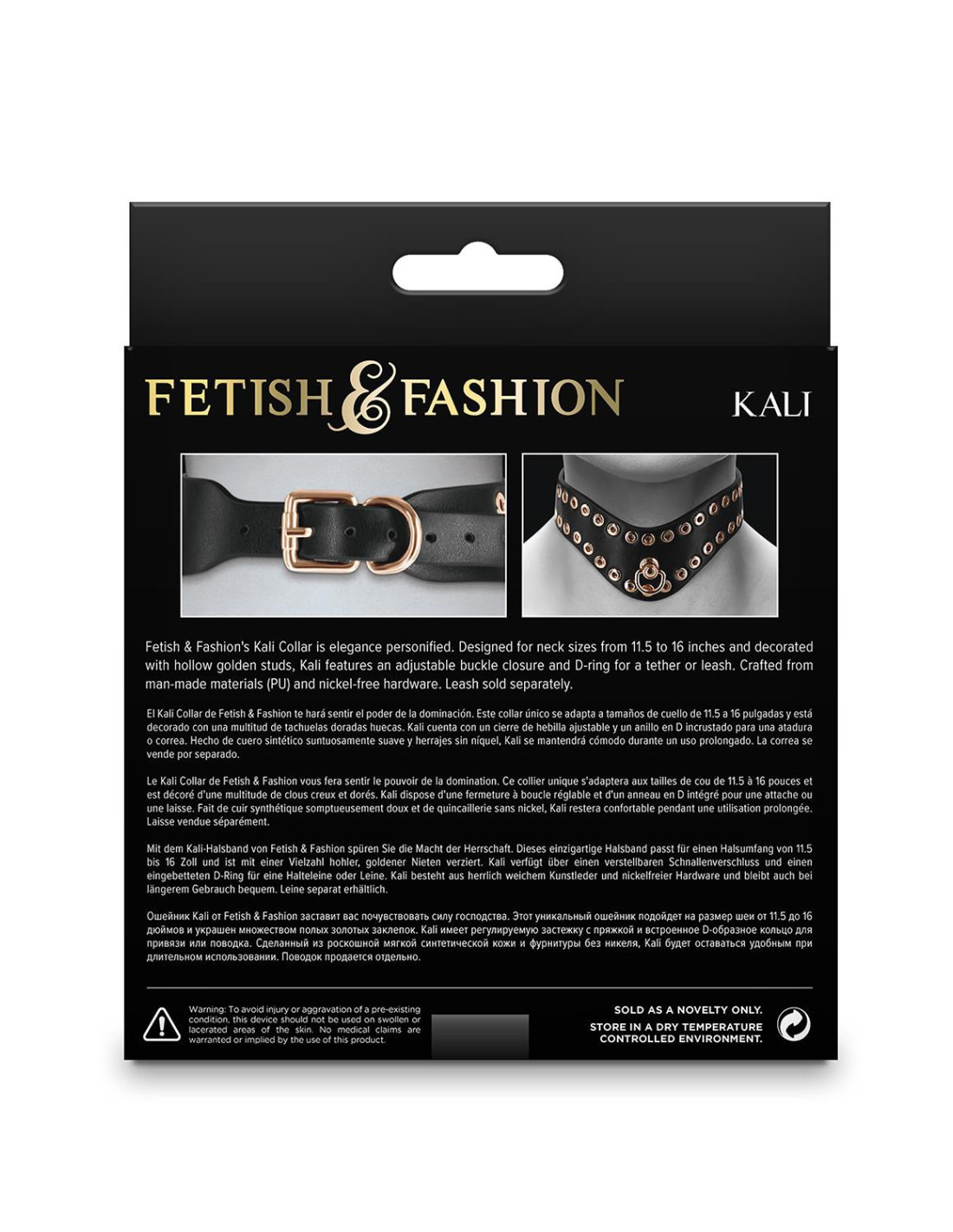 Fetish & Fashion’s Kali Collar is elegance personified. Designed for neck sizes from 11.5 to 16 inches and decorated with hollow golden studs, Kali features an adjustable buckle closure and D-ring for a tether or leash. Crafted from man-made materials (PU) and nickel-free hardware. Leash sold separately.Made of PU and nickel-free zinc-alloyPhthalate freeFor neck sizes from 29,2 - 40,6 cmAdjustable buckle closureD-ring