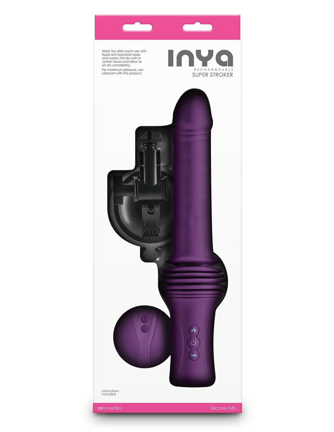 The Super Stroker by INYA features a 7 inch shaft with a long range of motion to produce deep thrusts and robust vibrations for eruptively orgasmic satisfaction. This vibrator includes a screw-in stand with a strong suction cup and a wireless remote for a hands-free setup, as well as a heating function for added sensations. The Super Stoker is rechargeable and suitable with all lubricants. Indulge in euphoric pleasure with the INYA Super Stroker. Its 7-inch shaft delivers deep thrusts and powerful vibrations, guaranteeing explosive orgasms. This vibrator boasts a screw-in stand with a robust suction cup and a hands-free wireless remote. Experience added sensations with the heating function. Rechargeable and compatible with all lubricants, it offers 3 stroking and vibration speeds, 7 patterns, and a warming feature. Elevate your pleasure with this versatile, innovative toy. (Includes 2 AAA battery for remote.)Deep thrusts and robust vibrationsVersatile with a screw-in standStrong suction cupWireless remote for hands-free play.Compatible with all lubricants3 stroking and vibration speeds + 7 vibration patterns + 1 warming functionWith remote control23A Battery for remote includedMade of silicone and ABSPhthalate freeRechargeable with magnetic USB cableCharging time: 150 minutesUse time:: 60 minutesWater resistant: noHeight:  Vibe: 36,8 cm, Remote: 5,8 cm, Stand: 9,2 cmWidth: Vibe: 6,9 cm, Remote: 6,0 cm, Stand: 8,2 cm