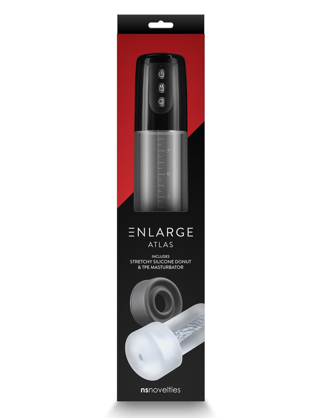 Simplify your pleasure with Atlas from Enlarge. Enjoy deep stroking action with Atlas' powerful 3 speed motor. 2.5 inch acrylic tube with measurement indicator is easy to clean and maintain.The Atlas penis pump is battery operated and has a quick release button. The Enlarge Atlas includes a stretchy silicone donut and TPE masturbator. 3 speedsMade of ABS, TPE and siliconeBattery operated, requires 3 AAA batteries, not includedWater resistant IPX6Product dimensions: 11.65 x 2.8 x 2.8 inch / 29,6 x 7,1 x 7,1 cmInsertable dimensions: 8.03 x 2.72 inch / 20,4 x 6,9 cm
