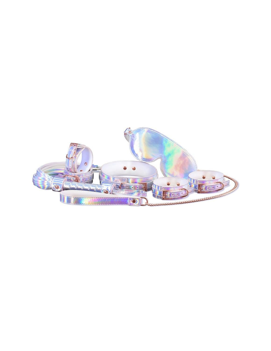 Light up the night with Cosmo's holographic bondage kit. Everything one needs for the master and servant. Accented with Rose Gold nickle free hardware and fully adjustable for universal fit. Made from easy to clean Vinyl. Includes wrist and ankle cuffs, collar and leash, blindfold, and flogger. Whether for a playful, gentle tease or some of the rough stuff, the Cosmo Bondage 6-Piece Kit has you covered. This spicy set has all the necessities to keep your servant where they belong — or for you if you're feeling submissive tonight. Made with vinyl, the wrist and ankle cuffs come complete with sexy rose gold hardware for a gorgeous finishing touch. Feeling a little extra kinky? Try the collar and leash on for size. Don’t forget the blindfold to always keep you or your partner left guessing what’s coming next. The kit even comes with a flogger so that you can remind them who’s the boss.With this kit, there’ll be no mistaking who’s really in charge of the naughty festivities. Complete with ankle and wrist cuffs, a collar, a leash, a blindfold, and a flogger, this has absolutely everything necessary to unleash your inner sub-dom energy.6 Piece bondage kitMade from vinylRose gold nickle free hardwareEasy to cleanIncludes: - wrist cuffs- ankle cuffs- collar & leash- blindfold- flogger