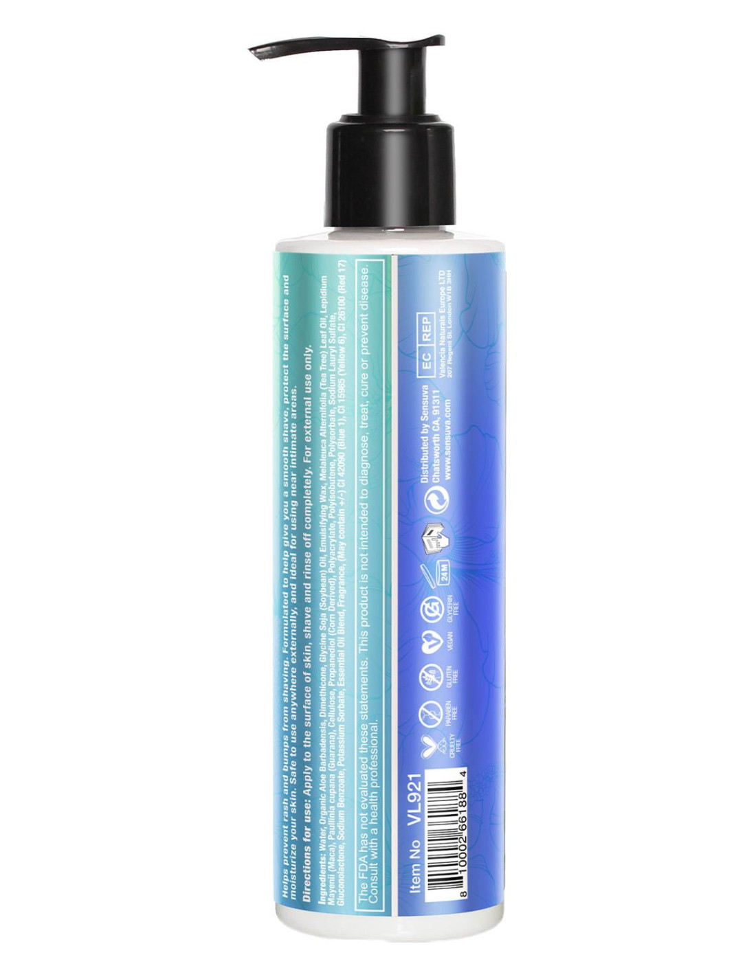 Helps prevent rash and bumps from shaving. Formulated to help give you a smooth shave, protect the surface and moisturize your skin. Safe to use anywhere externally, and ideal for using near intimate areas.Sweet Temptation: Vanilla, Sugar, Sweet PeaDirections for use: Apply to the surface of skin, shave and rinse off completely. For external use only.Ingredients: Water, Organic Aloe Barbadensis, Dimethicone, Glycine Soja (Soybean) Oil, Emulsifying Wax, Melaleuca Alternifolia (Tea Tree) Leaf Oil, Lepidium Mayenii (Maca), Paullinia cupana (Guarana), Cellulose, Propanediol (Corn Derived), Polyacrylate, Polyisobutene, Polysorbate, Sodium Lauryl Sulfate, Gluconolactone, Sodium Benzoate, Potassium Sorbate, Essential Oil Blend, Fragrance