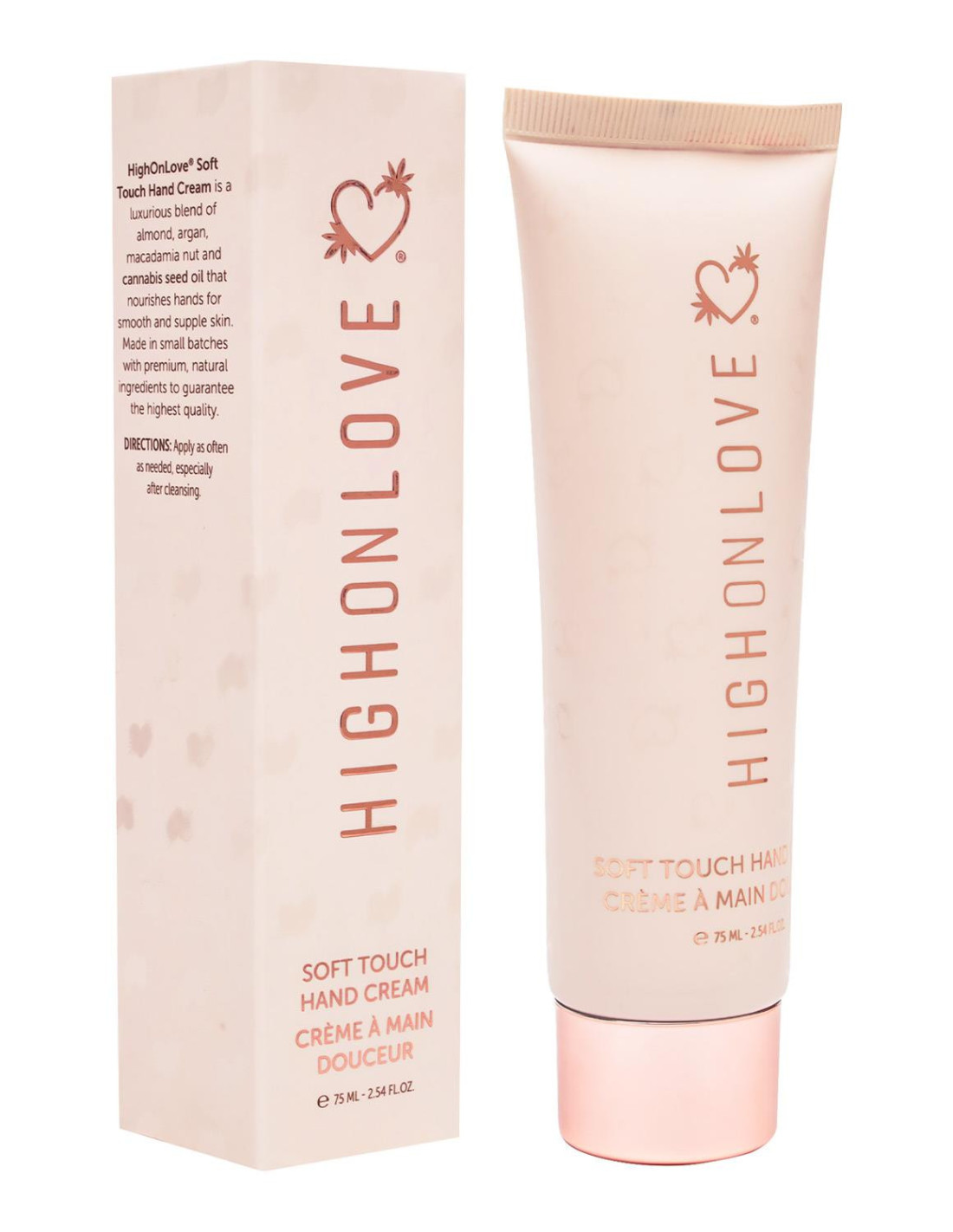 Soft Touch Moisturizing Hand CreamA luxurious blend of almond, argan, macadamia nut and cannabis seed oil that nourishes hands for smooth and supple skin. Made in small batches with premium, natural ingredients to guarantee the highest quality.FAQ: How often should I use HighOnLove® Soft Touch Hand Cream?Whenever you'd like! We like to use it after washing, or whenever our hands feel extra dry (winter, we're looking at you). It's also a lovely last step to your regular nail care routine.Ingredients:Aqua, Cetearyl Alcohol, Ceteareth-20, Prunus Amygdalus Dulcis Oil, Glycerin, Glyceryl Stearate, Rosmarinus Officinalis (Rosemary) Water, Argania Spinosa Kernel Oil,  Macadamia Ternifolia Seed Oil, Canabis Sativa (Hemp) Seed Oil, Benzyl Alcohol,Ethylhexylglycerin, Tocopherol, Parfum, Ceteareth 12, Sodium Polyacrylate, Caramel.