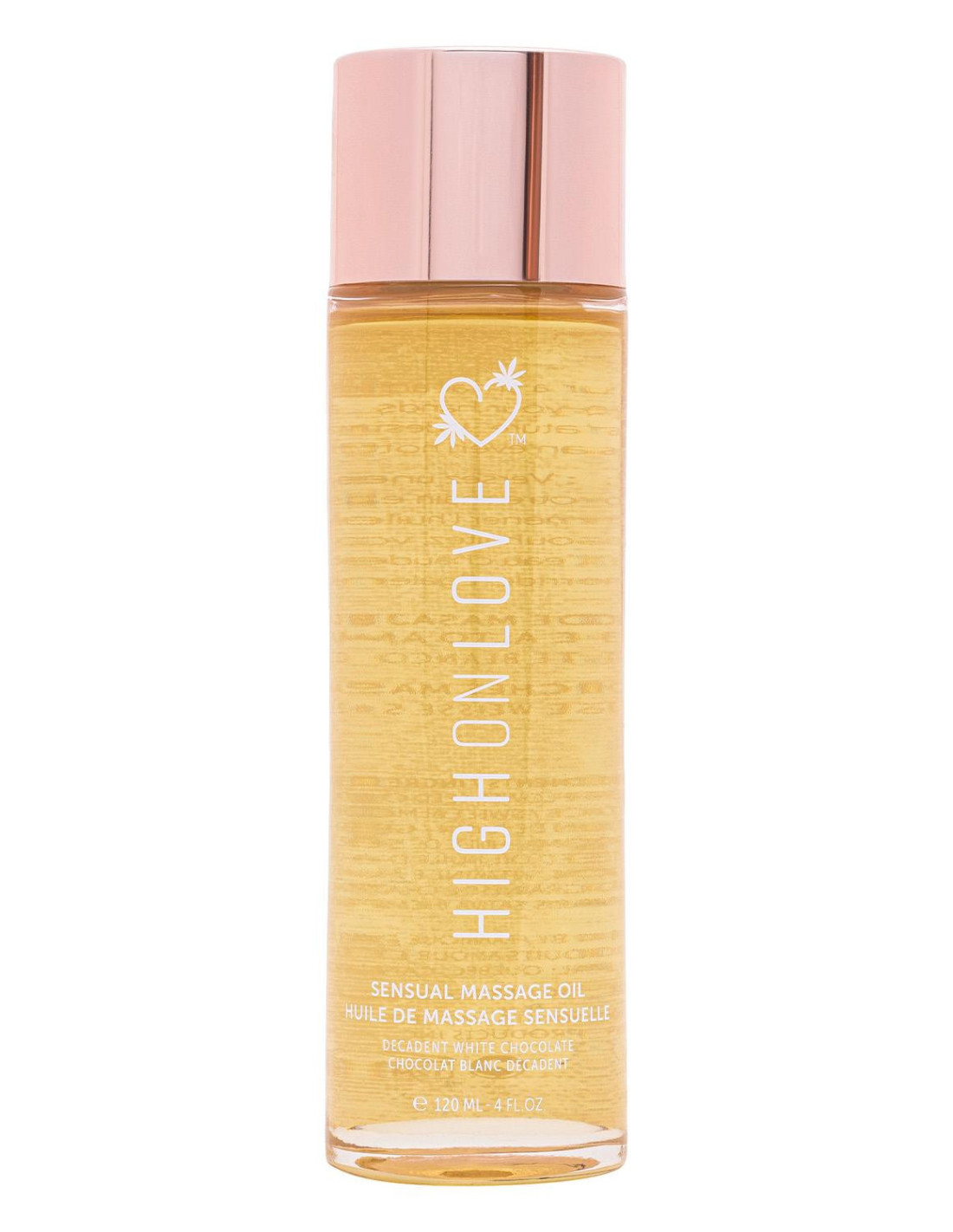 Decadent White Chocolate Sensual Massage Oil Revolutionizing the future of foreplay, this delectable blend of selected all natural oils with premium quality hemp seed oil nourishes the skin while simultaneously bringing harmony to the body and soul. This alluring oil has the ability to ease tension, increase energy flow and stimulate circulation, leaving your skin to feel velvety smooth. HighOnLove® Sensual Massage Oil glides heavenly to the touch and brings a whole new meaning to romance. 100% natural. Made in small batches to guarantee the highest quality.How to use: Warm a small amount between hands prior to skin application. If desired, heat the oil bottle in hot water for a warmer feeling to the touch. This oil is edible.FAQ: Can I use HighOnLove® Sensual Massage Oil as a lubricant?Yes. If you're anything like us, a steamy massage can quickly escalate. Luckily, the natural aromas and high-quality oils in this product are entirely safe for your intimate zones.Ingredients: