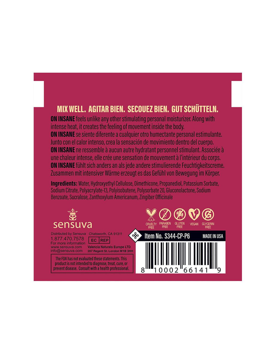 ON INSANE FLAVORED Moisturizers are the strongest, most intensely arousing personal moisturizers on the market. A number of users report the feeling of movement inside the body, plus an intensely warm sensation around the clitoris. ON INSANE Flavored Moisturizers are for those who love intense arousal, with a hint of sweet delicatable flavors.Ingredients:Water, Hydroxyethyl Cellulose, Dimethicone, Propanediol, Potassium Sorbate, Sodium Citrate, Polyacrylate-13, Polyisobutene, Polysorbate 20, Gluconolactone, Sodium Benzoate, Sucralose, Zanthoxylum Americanum, Zingiber Officinale VeganCruelty FreeGlycerin FreeParaben FreeGluten FreeEdibleDoes not stainSafe to use with toysProvides more clitoral stimulationFeels incredibly warm