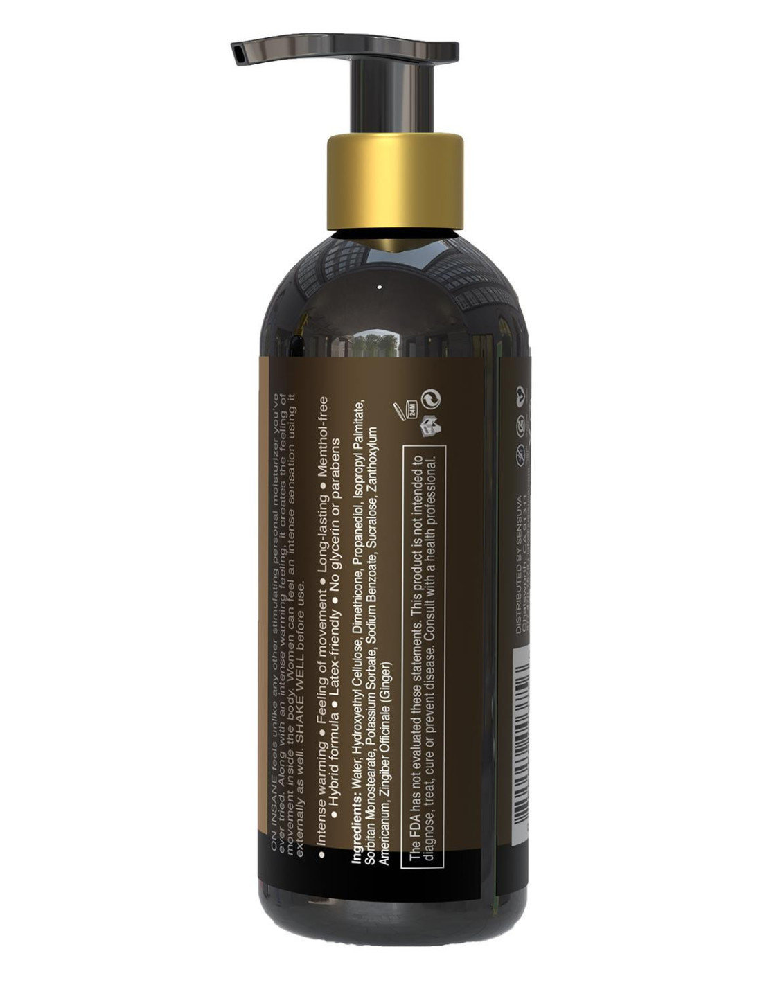 ON INSANE is the strongest, most intensely arousing personal moisturizer on the market. A number of users report the feeling of movement inside the body, plus an intensely warm sensation around the clitoris. ON INSANE is for those who love intense arousal, and may want to pair it with ON Arousal Products for a maximum effect.Ingredients:Water, Hydroxyethyl Cellulose, Dimethicone, Propanediol, Potassium Sorbate, Sodium Citrate, Polyacrylate-13, Polyisobutene, Polysorbate 20, Gluconolactone, Sodium Benzoate, Sucralose, Zanthoxylum Americanum, Zingiber Officinale VeganCruelty FreeGlycerin FreeParaben FreeGluten FreeEdibleDoes not stainSafe to use with toysProvides more clitoral stimulation