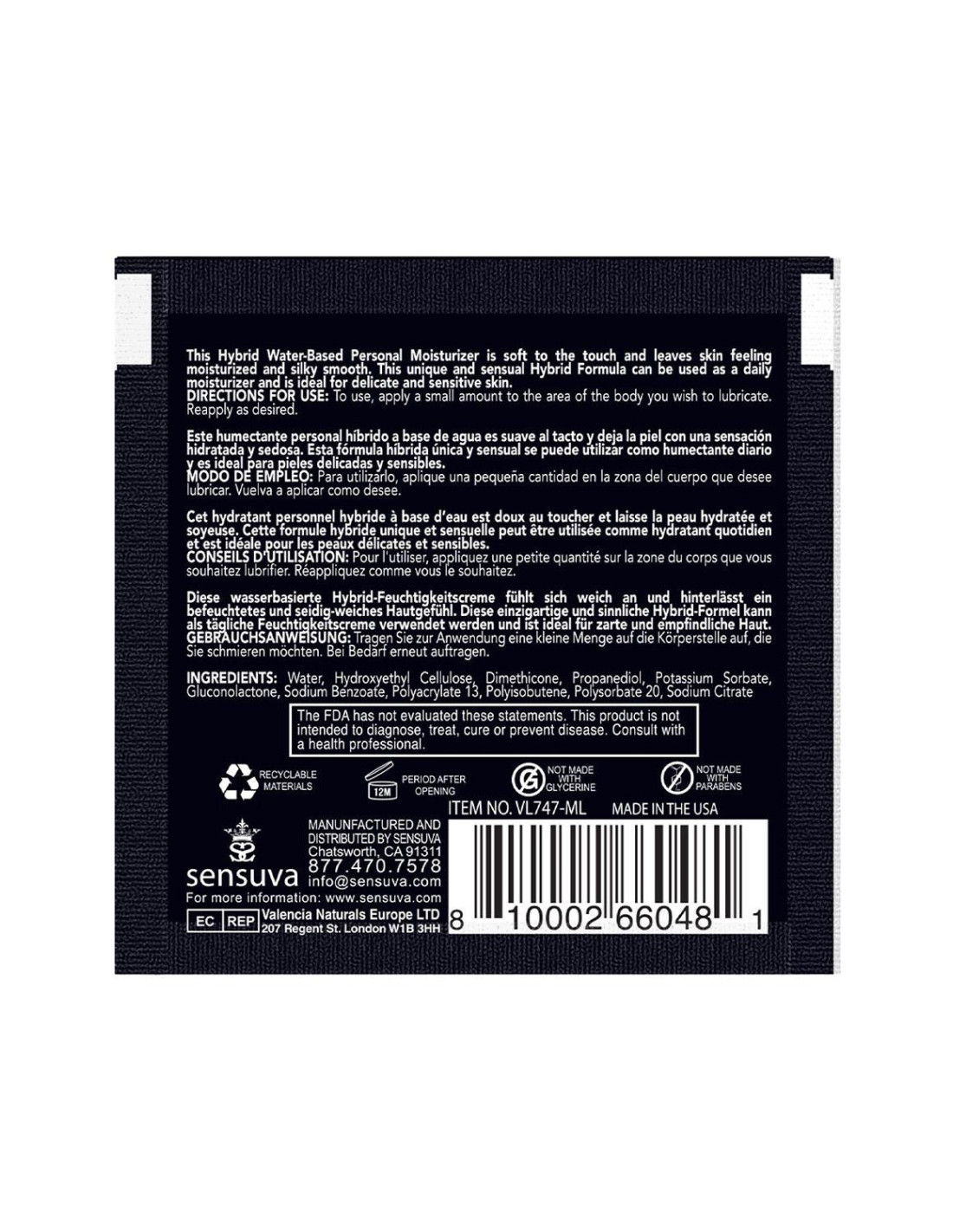 Sensuva's Hybrid Water-Based Personal Moisturizer is the healthiest hybrid formula. It is an exceptional water-based formula blended with a small amount of medical-grade silicone to provide a longer-lasting, sensual glide. It is thinner than silicone so you can feel the curves of your partner and does not become sticky or tacky like typical water-based personal moisturizers. Shake well before use.Ingredients:Water, Hydroxyethyl Cellulose, Dimethicone, Propanediol, Potassium Sorbate, Gluconolactone, Sodium Benzoate, Polyacrylate 13, Polyisobutene, Polysorbate 20, Sodium Citrate, Sucralose, Artificial Flavor Glycerin FreeParaben FreeGluten FreeNon-sticky formulaWater-based glide with a small amount of medical-grade silicone