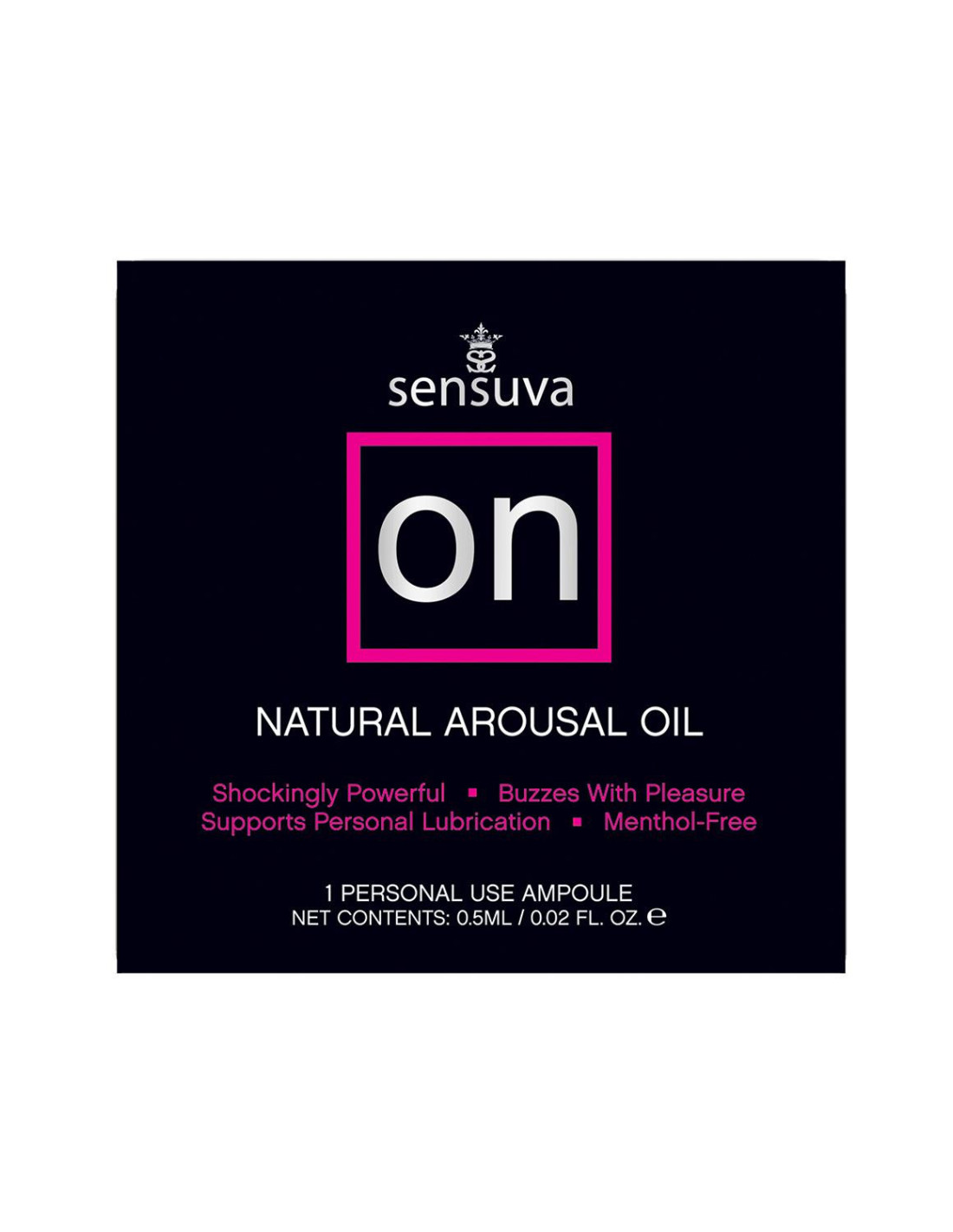 On™ Original Arousal Oil creates an exciting sensation that pulsates and vibrates the clitoris. Shockingly Powerful. Buzzes with Pleasure. Designed to enhance intimacy, On™ Original increases orgasm intensity, enhances clitoral sensitivity, elongates pleasure duration and frequency. On™ is made with a natural botanical blend of essential oils to create feelings of natural arousal and may increase self-lubrication in most users.Ingredients:Prunus Amygdalus Dulcis (Sweet Almond) Oil, Cinnamomum Zeylanicum (Cinnamon) Oil, Natural Tocopherols (vitamin e), Stevia Rebaudiana Extract, Zanthoxylum Americanum, Zingiber Officinale (Ginger), Natural Flavors, Rosmarinus Officinalis (Rosemary)VeganCruelty FreeParaben FreeGluten FreeGlycerin Free